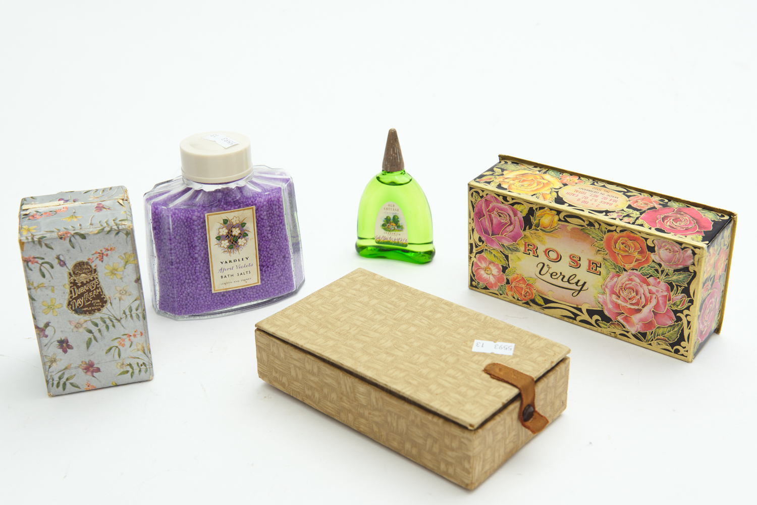 A COLLECTION OF VINTAGE PERFUME BOTTLES AND COSMETICS INCLUDING GROSSMITH AND YARDLEY LONDON, LEONARD JOEL DELIVERY SIZE: SMALL
