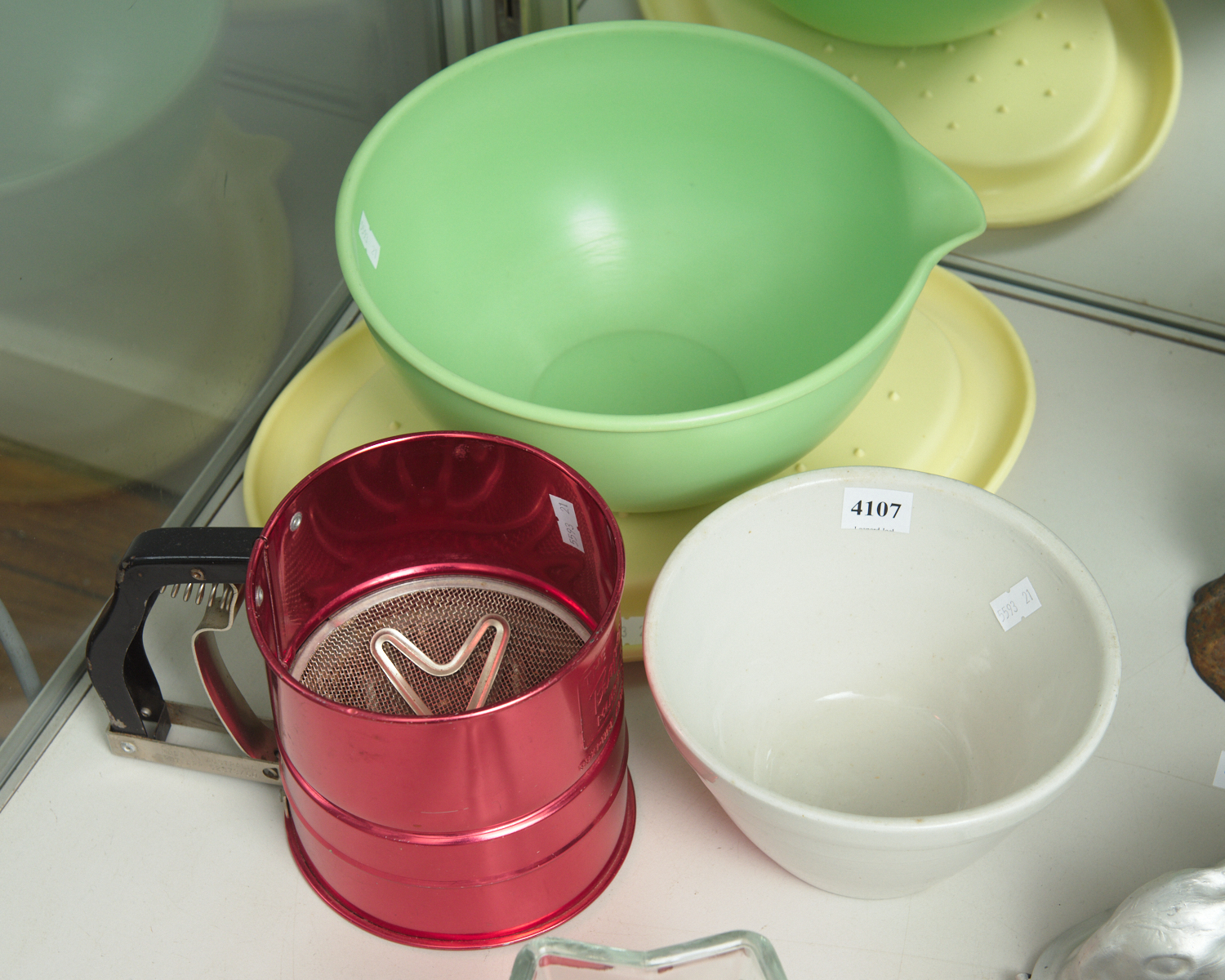 A VINTAGE GREEN BAKELITE MIXING BOWL TOGETHER WITH HOFFMAN MIXING BOWL, BAKELITE MEAT TRAY AND ANODISED PINK FLOUR SIFTER, THE LARGEST BOWL 23 CM DIAMETER, LEONARD JOEL LOCAL DELIVERY SIZE: SMALL