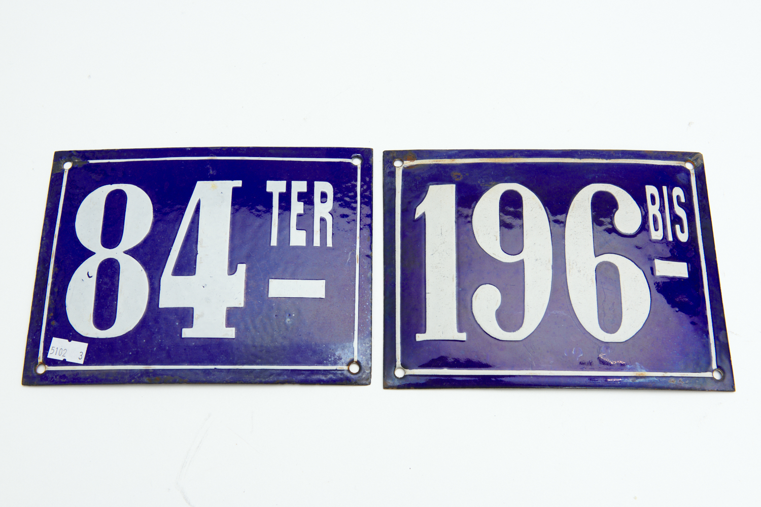 TWO C.1890S FRENCH ENAMEL HOUSE / STREET NUMBER SIGNS INC 84 TER AND 196 BIS, LEONARD JOEL DELIVERY SIZE: SMALL