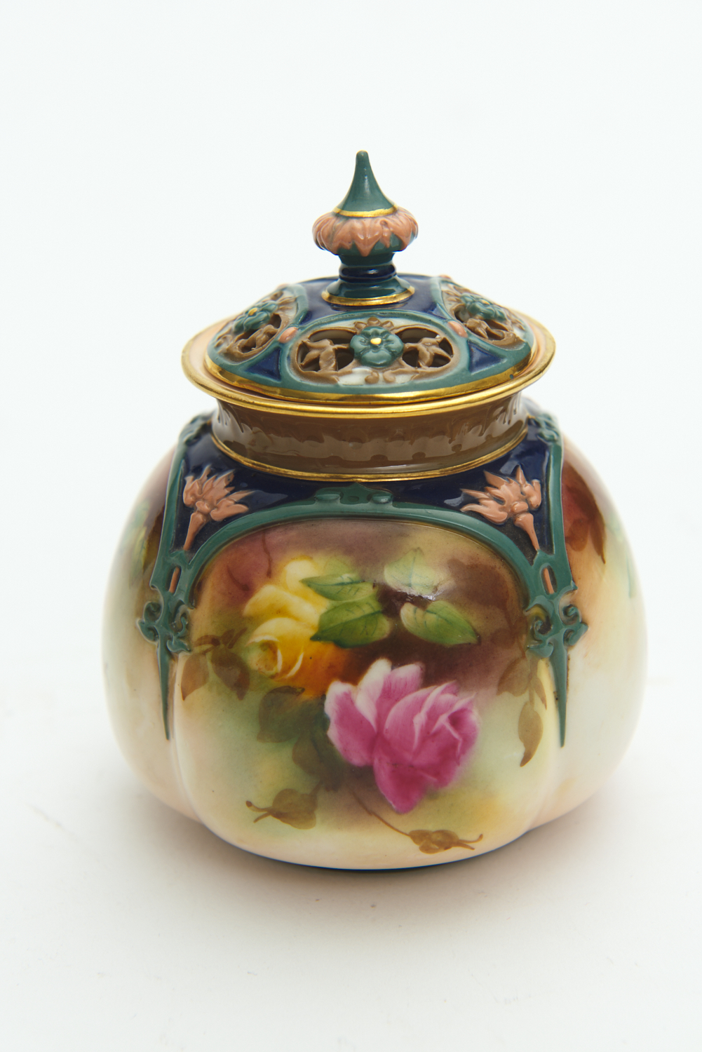 A ROYAL WORCESTER ROSES PAINTED LIDDED POT POURRI, H.11CM, LEONARD JOEL DELIVERY SIZE: SMALL