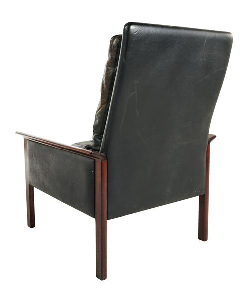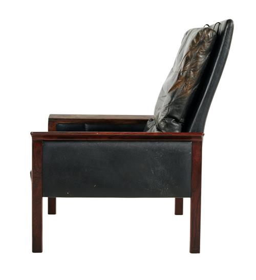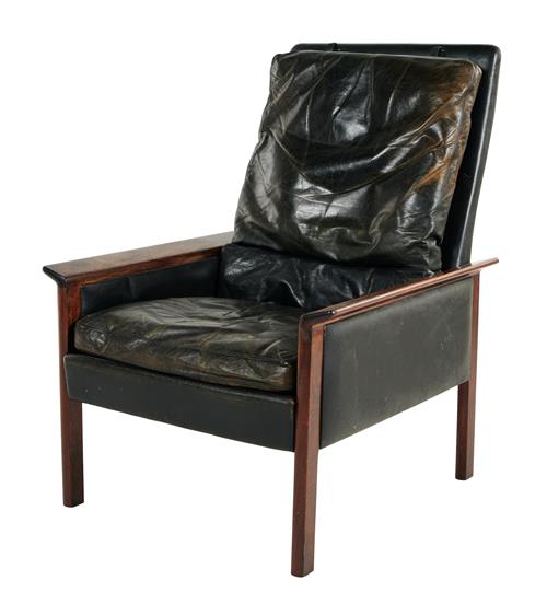 Highly distressed leather with marks and wear. Top leather straps damaged. Frame structurally sound, however staining to rosewood arms, moderate surface marks throughout consistent with use.