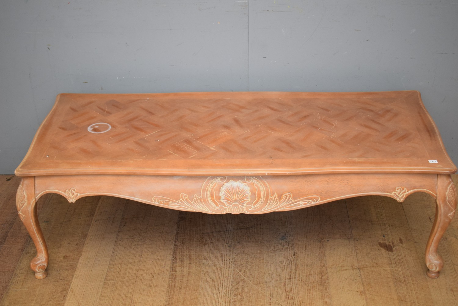 A LARGE FRENCH STYLE COFFEE TABLE WITH PARQUETRY TOP (A/F) (42H x 137W x 62D CM) (LEONARD JOEL DELIVERY SIZE: LARGE)
