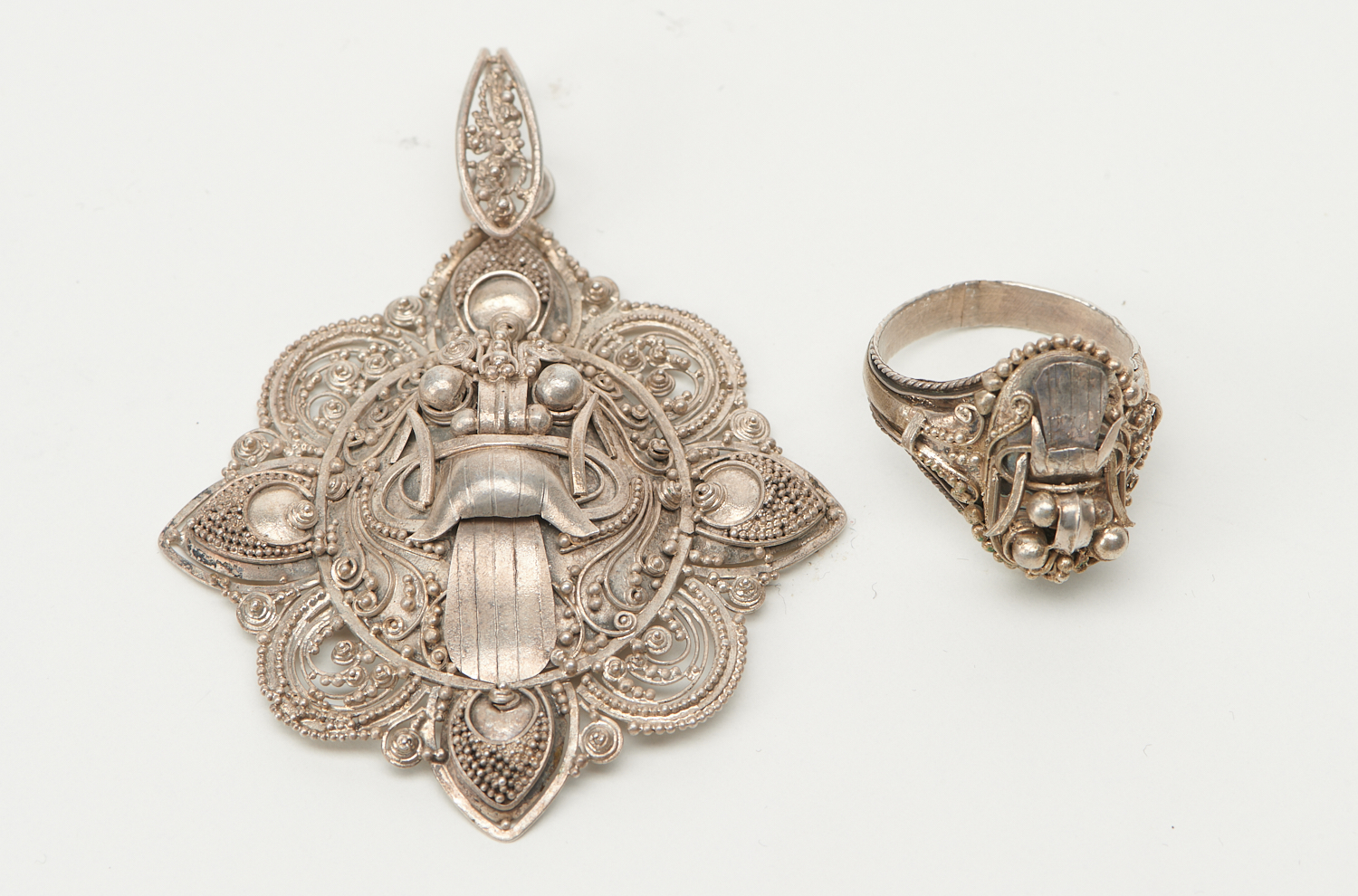Both items depicting a mythological deity with the tongue out; very fine details and craftsmanship to both items.