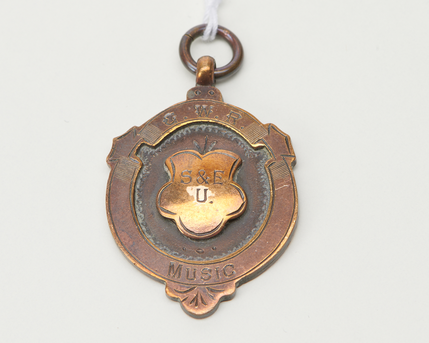 AN ANTIQUE GREAT WESTERN RAILWAY MUSIC MEDAL, INSCRIBED G.W.R. S&E U, DATED ON THE REVERSE 1930, THE CENTRE MOTIF IN 9CT GOLD, LENGTH 42MM