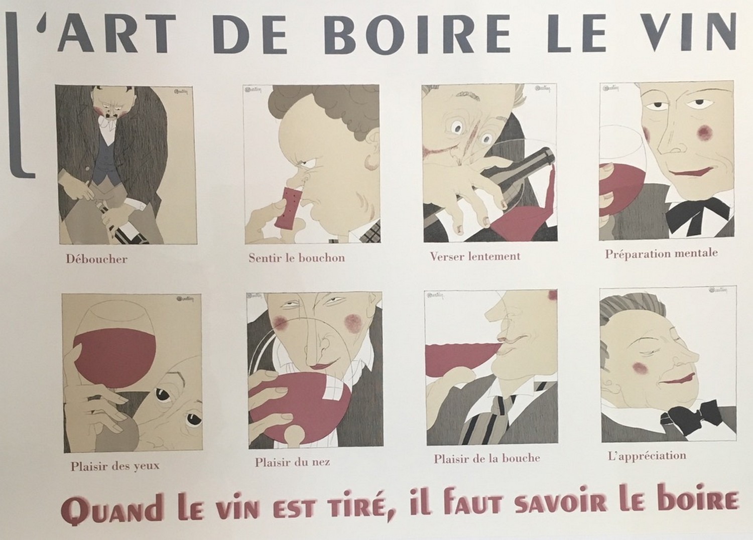 This poster was derived from a series of illustrations on the different stages of drinking wine. There is the uncorking, smelling the cork, pour slowly, mental preparation, the pleasure of the eyes, the pleasure of the nose, the pleasure of the mouth, and finally, the appreciation.