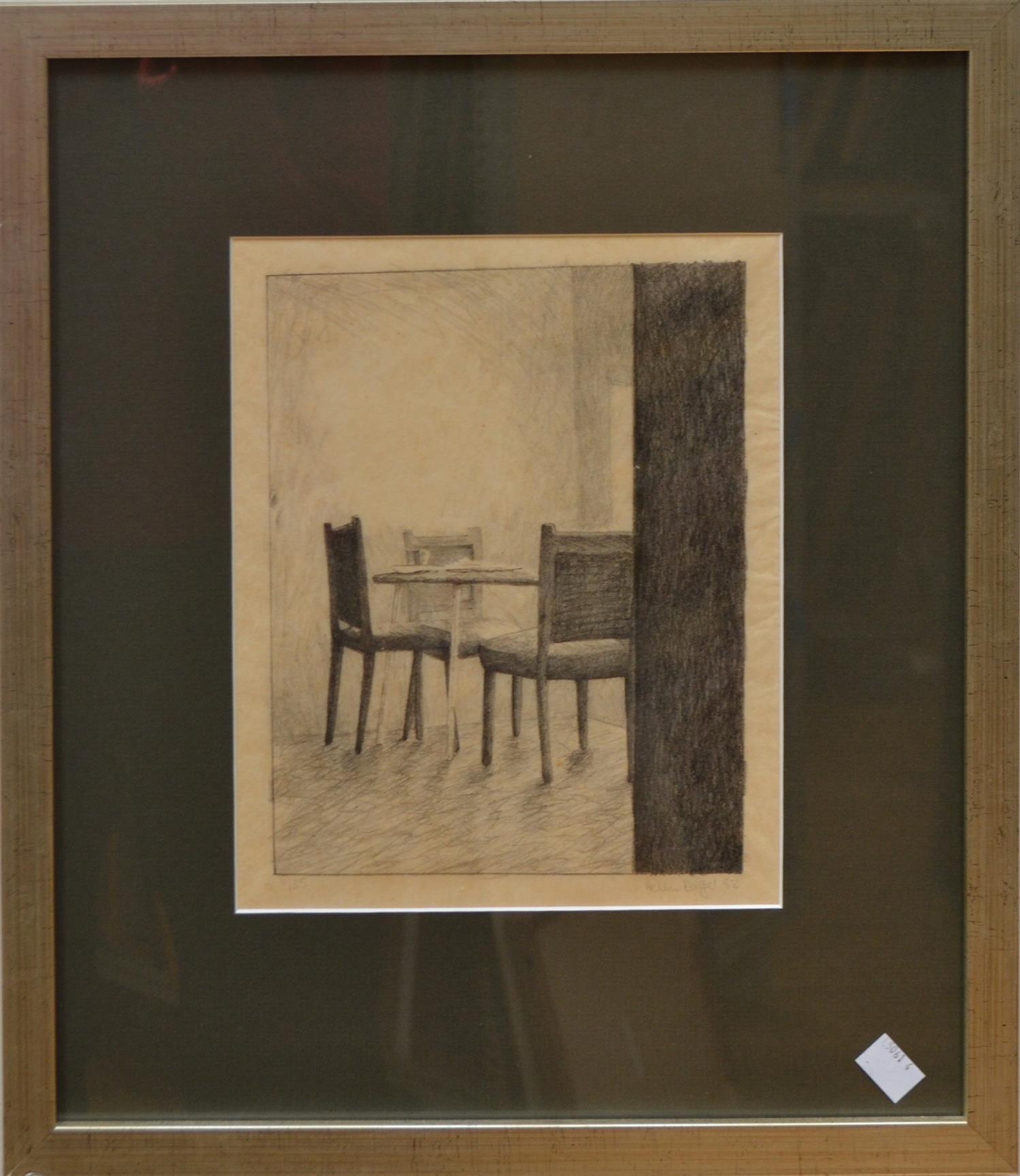 HELEN EAGER, CHAIR SETTING 1982, LITHOGRAPH 11/35, 23.5 X 18CM, FRAME SIZE: 46 X 39.5CM, CONDITION: MINOR HANDLING MARKS ACROSS RIGHT HAND SIDE, OTHERWISE GOOD CONDITION, LEONARD JOEL DELIVERY SIZE: SMALL