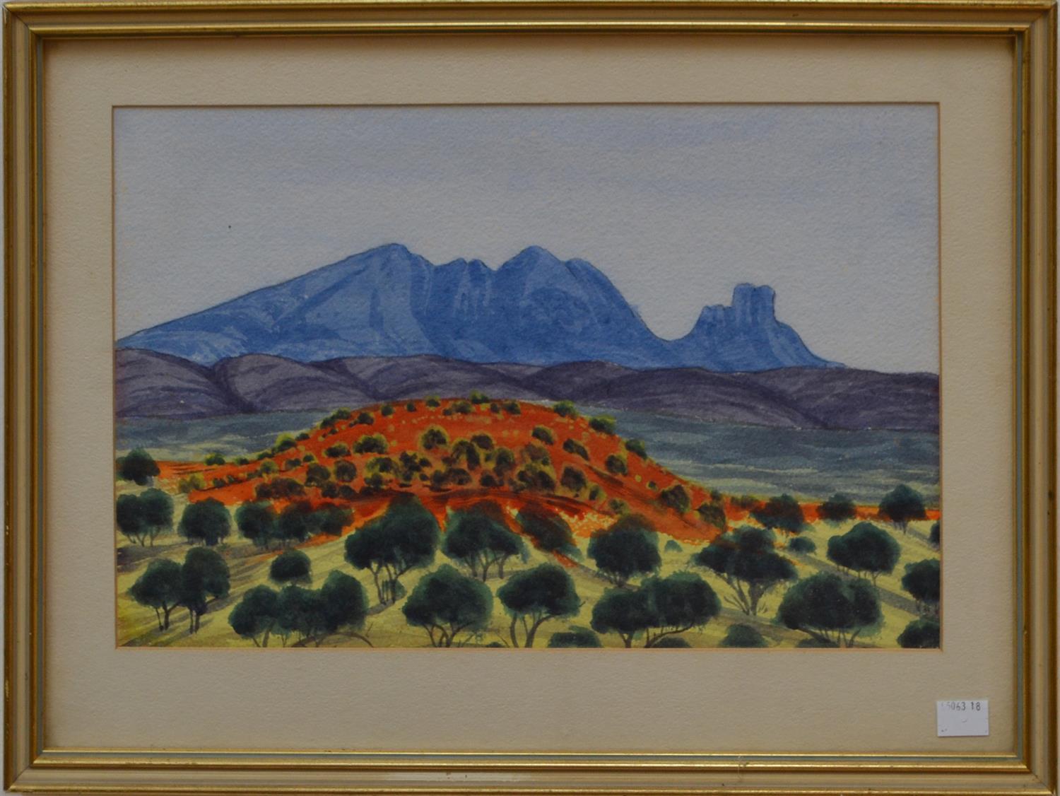 HERMANNSBURG SCHOOL, CENTRAL AUSTRALIAN LANDSCAPE, WATERCOLOUR, 25 X 37.5CM, FRAME SIZE: 36 X 47.5CM, CONDITION: GOOD CONDITION, NO FAULTS TO REPORT, LEONARD JOEL DELIVERY SIZE: SMALL