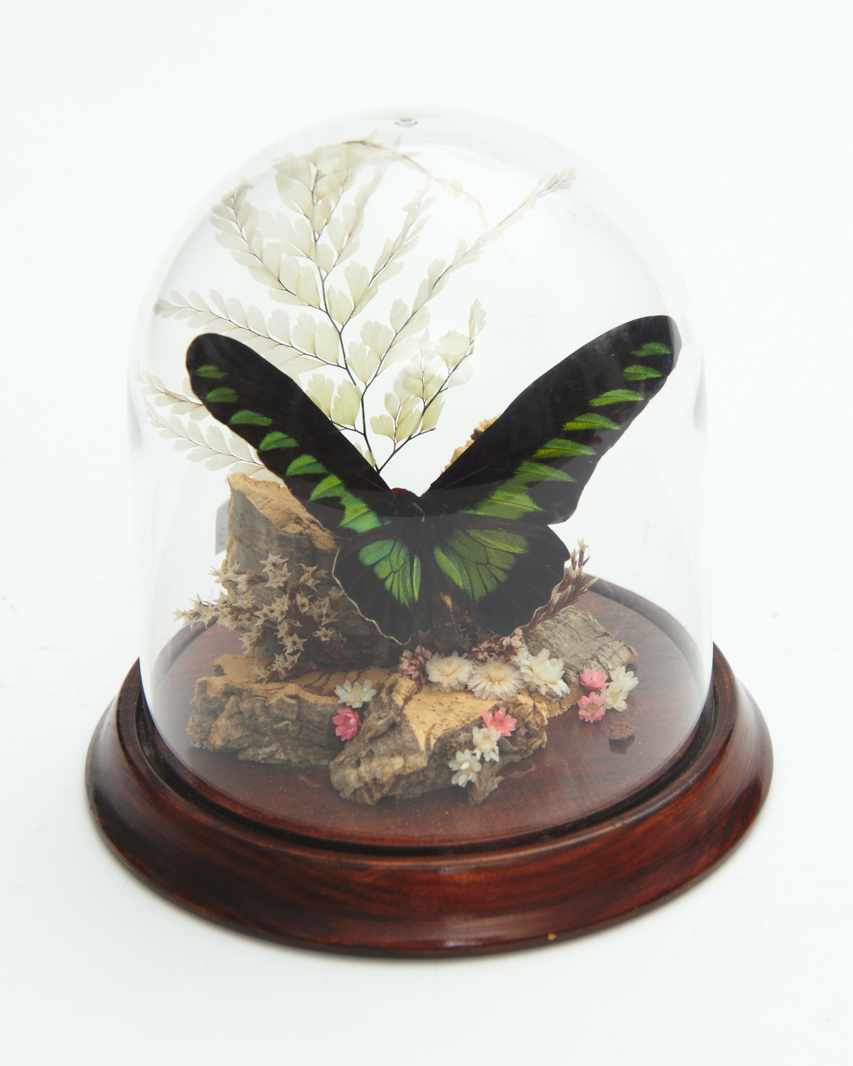 A BUTTERFLY DIORAMA BENEATH A PERSPEX DOME, 17 CM HIGH, LEONARD JOEL DELIVERY SIZE: SMALL