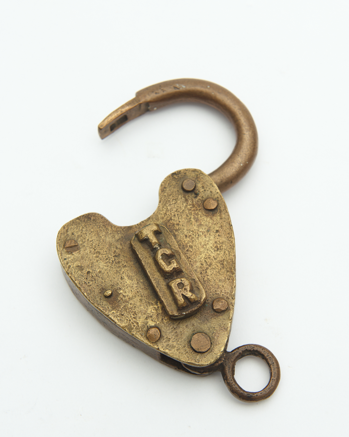 AN BRASS PADLOCK, CAST WITH THE INITIALS 'TGR', 12 CM HIGH (NO KEY) LEONARD JOEL DELIVERY SIZE: SMALL