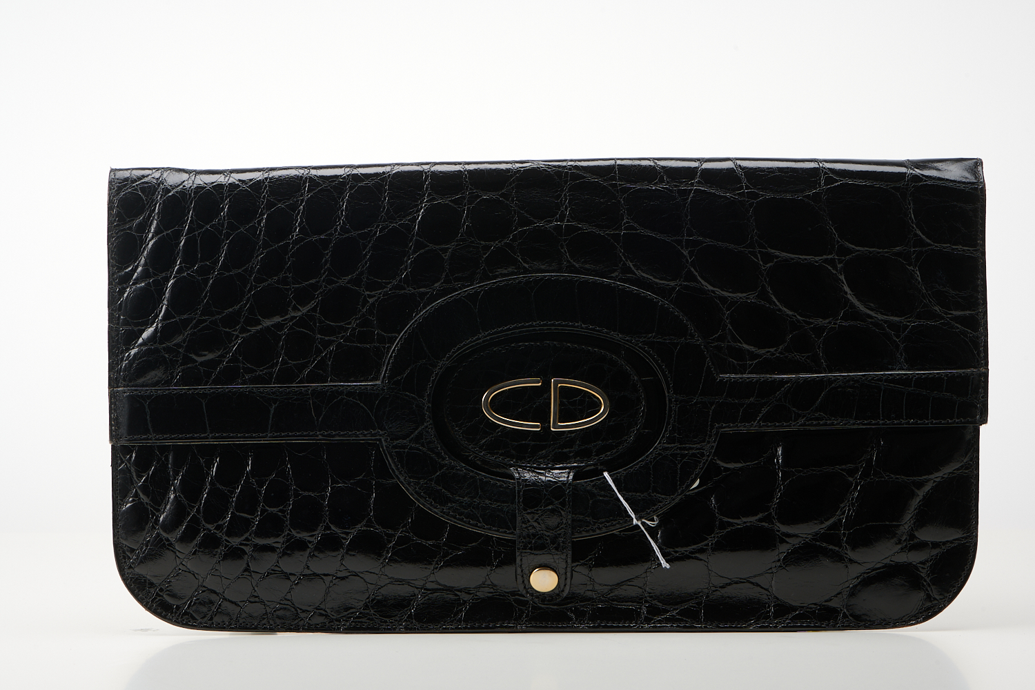 Styled in black crocodile leather with gold metal hardware, 39 x 21cm, circa 1980.