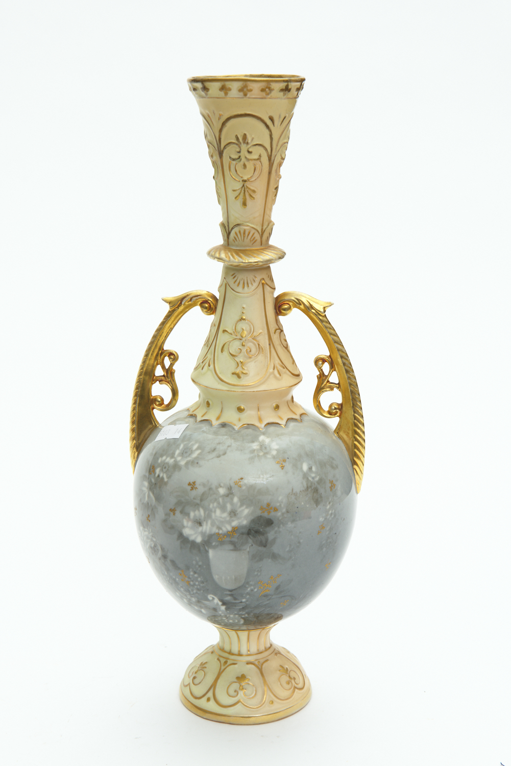 A HAND PAINTED VASE, (A/F, RESTORATION TO THE TOP SECTION OF THE NECK),37.5 CM HIGH, LEONARD JOEL DELIVERY SIZE: SMALL