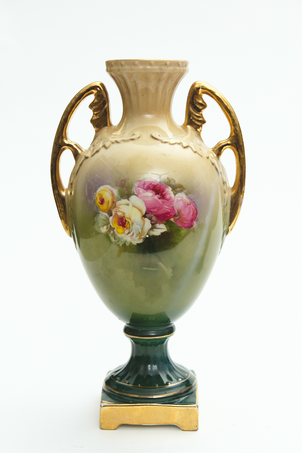 A LARGE HAND PAINTED FLORAL VASE, 41.5 CM HIGH, LEONARD JOEL DELIVERY SIZE: SMALL