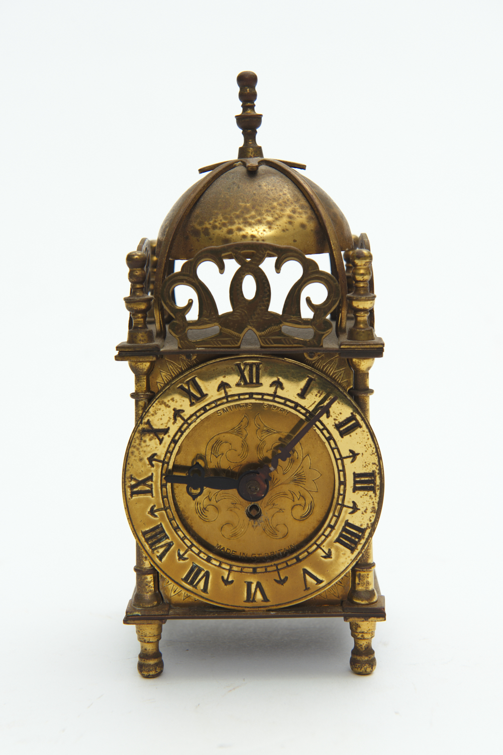 A BRASS LANTERN CLOCK IN THE GEORGIAN STYLE, WITH A SMITHS ELECTRIC MOVEMENT H.18CM, LEONARD JOEL DELIVERY SIZE: SMALL