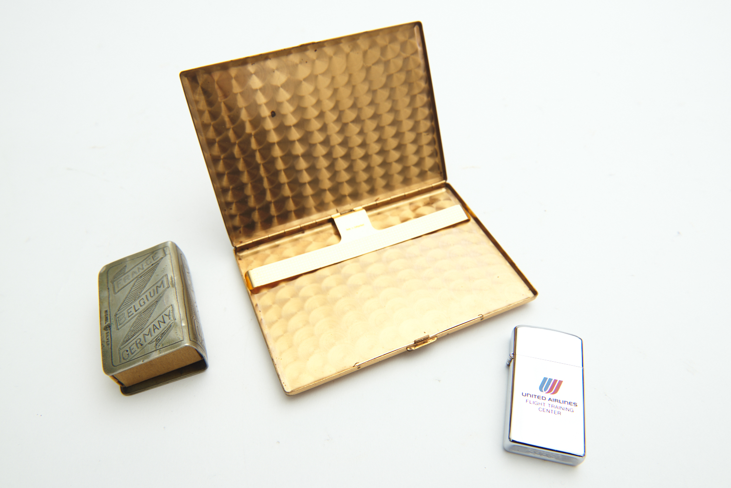 A VINTAGE MATCH VESTA, A SWISS CIGARETTE CASE AND A BOXED ZIPPO UNITED AIRLINES PROMOTIONAL CIGARETTE LIGHTER, LEONARD JOEL DELIVERY SIZE: SMALL