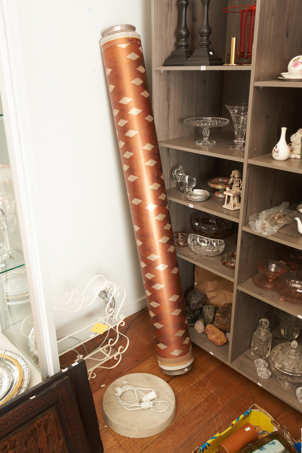 A FRENCH COPPER GRAVURE DRUM, ACCOMPANIED BY A LIGHT FITTING FOR POTENTIAL FUTURE USE AN INDUSTRIAL STYLE FLOOR LAMP (INCOMPLETE, UNTESTED), H.180CM, LEONARD JOEL LOCAL DELIVERY SIZE: SMALL
