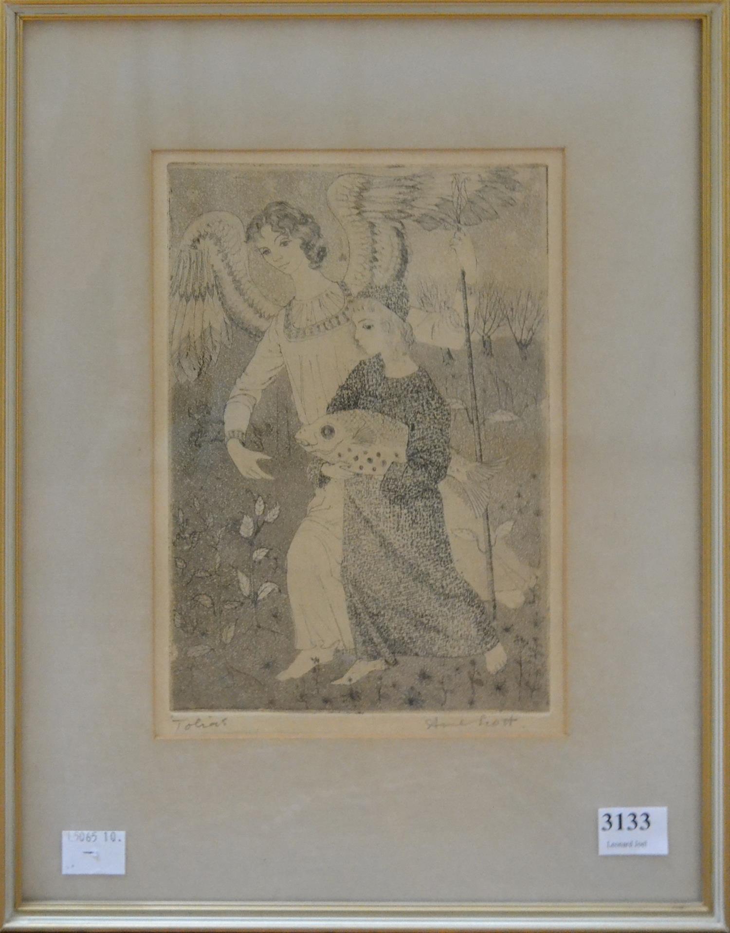 ANNE SCOTT, TOBIAS, ETCHING, IMAGE SIZE: 20 X 14CM, FRAME SIZE: 34 X 27CM, CONDITION: DISCOLOURATION AND YELLOWING TO THE PAPER. LEONARD JOEL DELIVERY SIZE: MEDIUM