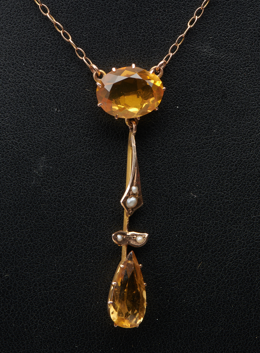 AN EDWARDIAN AUSTRALIAN CITRINE AND SEED PEARL DROP NECKLACE, HALLMARKED BY DUMBRELL OF MELBOURNE, IN 9CT GOLD, TOTAL LENGTH 40MM, 3.5GMS