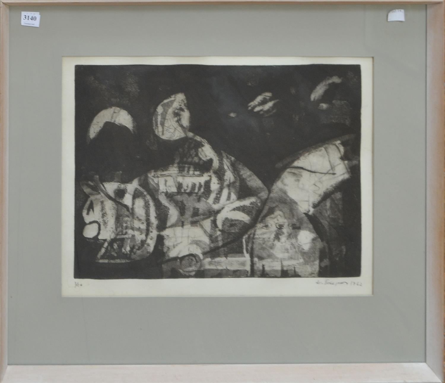 KAREN SCHEPES, III 1962, AQUATINT 3/20, IMAGE SIZE: 30 X 40CM, FRAME SIZE: 54 X 62CM, CONDITION: COCKLING AND DISCOLOURATION SEEN. LEONARD JOEL DELIVERY SIZE: MEDIUM