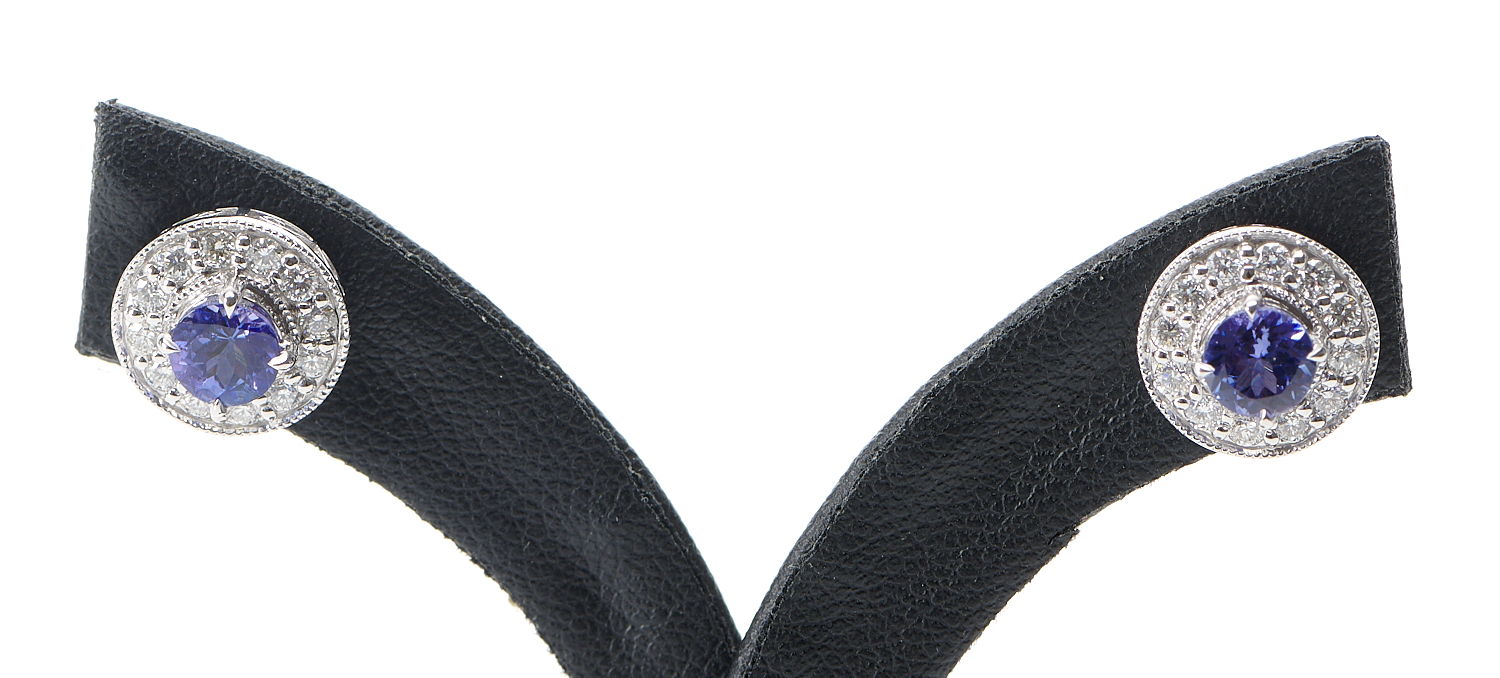 A PAIR OF TANZANITE AND DIAMOND CLUSTER STUD EARRINGS, THE TANZANITES TOTALLING 1.0CT AND DIAMONDS TOTALLING 0.44CTS, TO POST AND BUTTERFLY FITTINGS, IN 18CT WHITE GOLD, DIAMETER 10MM, 3.9GMS