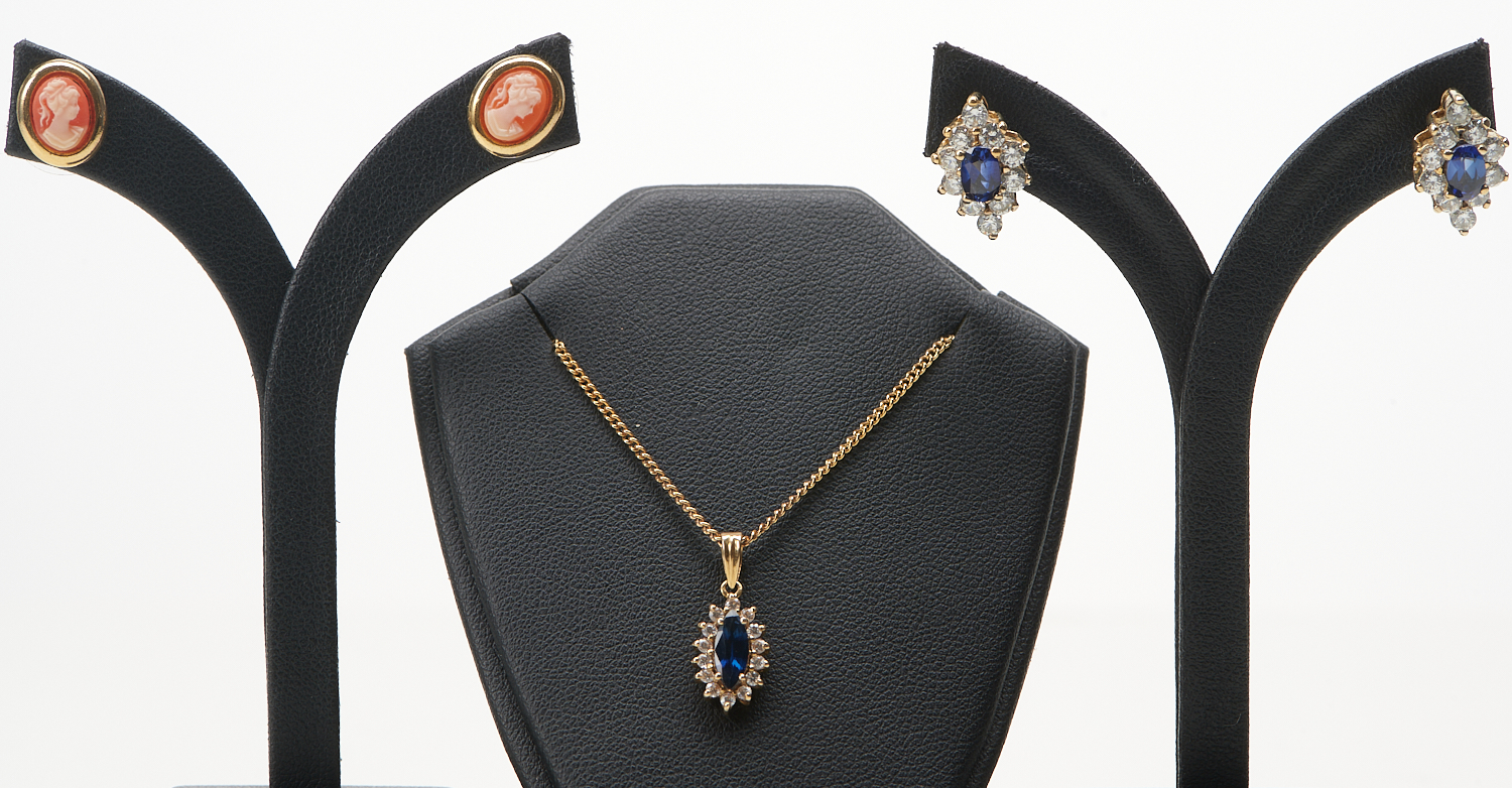 A PAIR OF BLUE AND COLOURLESS STONE SET EARRINGS IN SILVER GILT, TOGETHER WITH A BLUE AND COLOURLESS STONE SET PENDANT IN 14CT GOLD, ON PLATED CHAIN AND A PAIR OF CAMEO STUD EARRINGS (NO BACKS) IN GILT