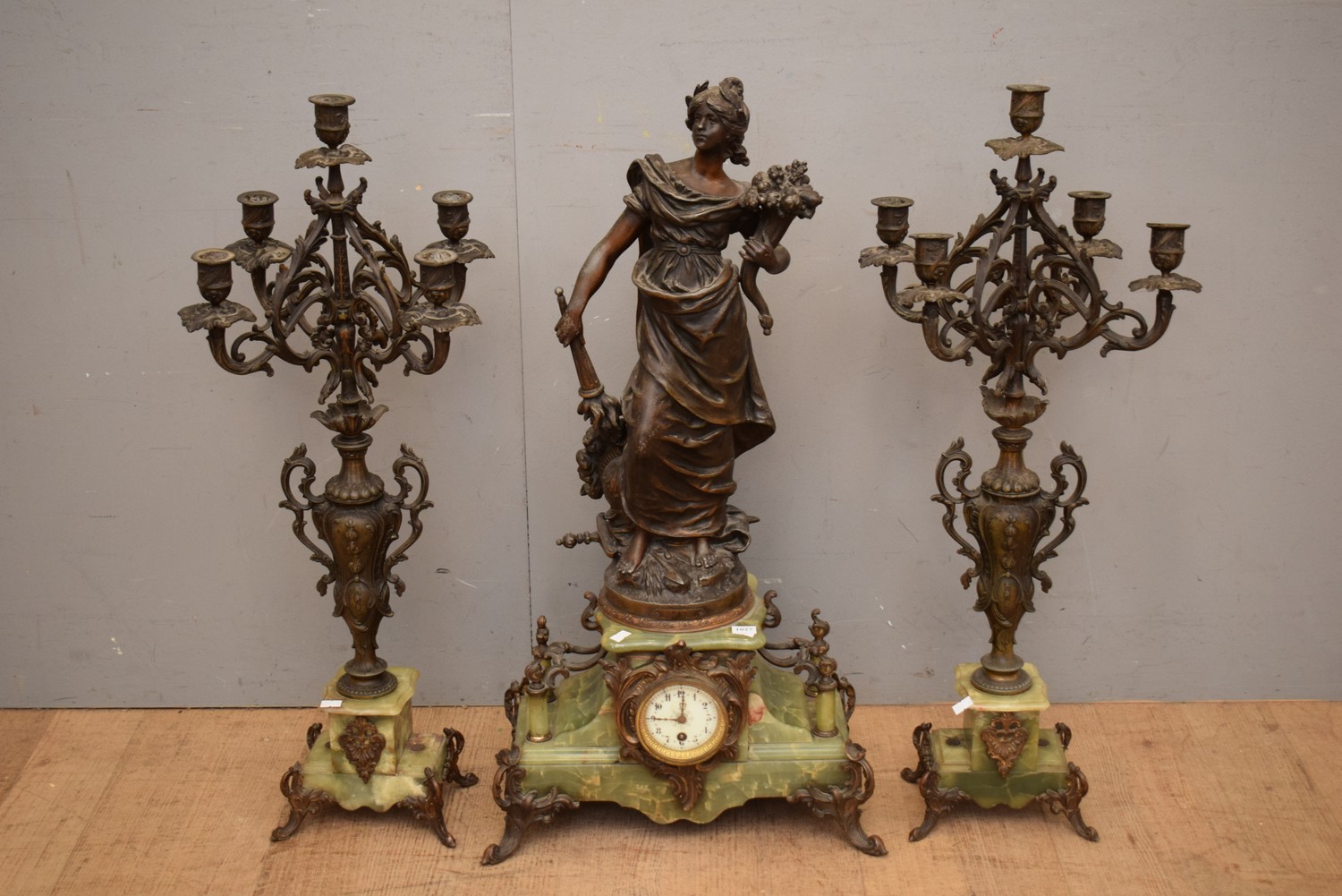 A HIGHLY DECORATIVE THREE PIECE SPELTER AND ONYX GARNITURE (A/F) (83H CM) (PLEASE NOTE THIS HEAVY ITEM MUST BE REMOVED BY CARRIERS AT THE CUSTOMER'S EXPENSE. LEONARD JOEL STAFF CANNOT ASSIST CARRYING THIS ITEM) (LARGE ITEM)