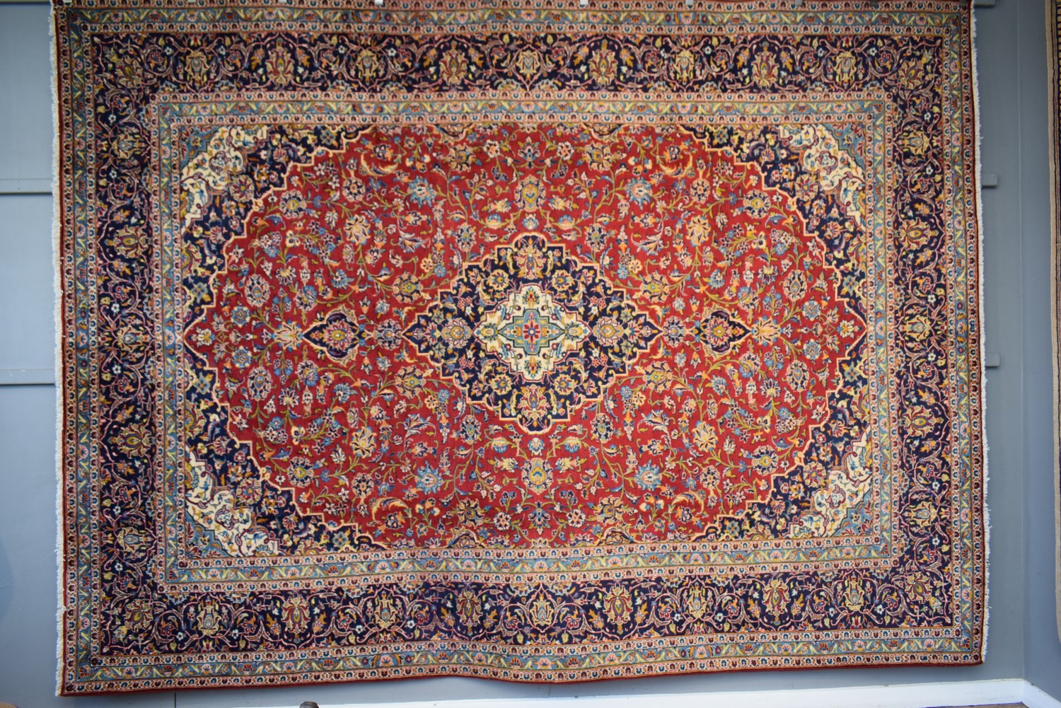 A LARGE HAND-KNOTTED PERSIAN KASHAN CARPET, 100% WOOL. DENSE PILE. HAND-KNOTTED 'FATAHI' ATLIER WEAVE. CLASSIC KASHAN BOOK-COVER DESIGN OF ELONGATED FLORAL MEDALLION & CORNER MEDALLIONS IN A RED FIELD OF PALMETTES, FLORAL SPRAYS & TENDRILS. BORDER OF PALMETTES AND TENDRILS. STURDY & HARD-WEARING. EX-GALLERY STOCK. IN SUPERB CONDITION. CERTIFICATE OF AUTHENTICITY INCLUDED. SIZE: 393X293CM ORIGIN: KASHAN/PERSIA – RRP: $6,900 (LEONARD JOEL DELIVERY SIZE: X-LARGE)