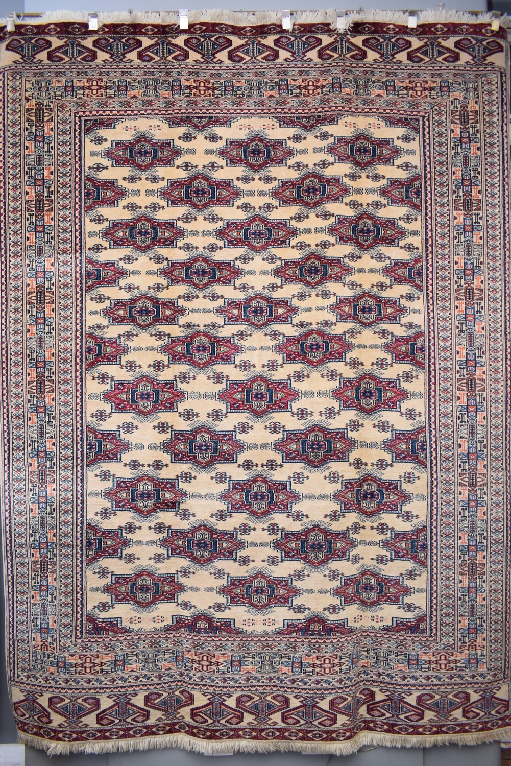 A FINE TRIBAL TURKOMAN RUG. 100% WOOL PILE & FOUNDATION. DENSE PILE. HAND-KNOTTED TRIBAL WEAVE WITH TRADITIONAL DESIGN OF ALL-OVER TYRKOMAN GUL MOTIFS IN A CREAM FIELD. EX-GALLERY INVENTORY. IN EXCELLENT CONDITION. CERTIFICATE OF AUTHENTICITY INCLUDED. SIZE: 275X206CM ORIGIN: PERSIA – RRP: $3,900 (LEONARD JOEL DELIVERY SIZE: LARGE)