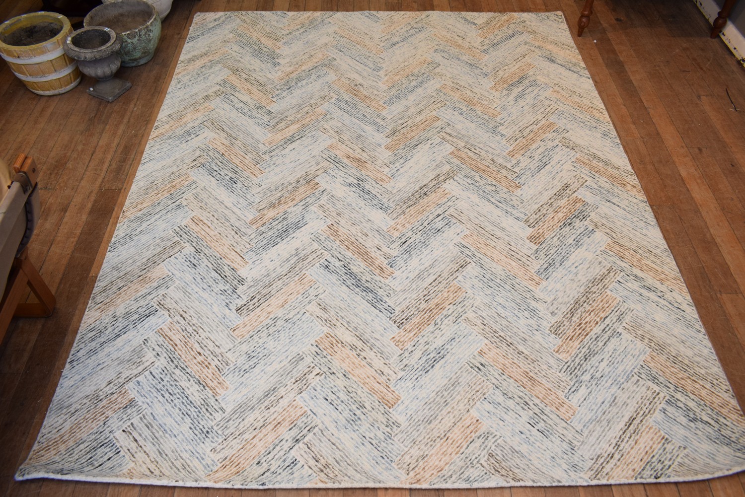 A MODERN CARPET IN TONES OF CREAM, BLUE, BROWN & ROSE. HAND-TUFTED. 100% WOOL. SOLID & HARD-WEARING. BRAND NEW & IN EXCELLENT CONDITION. SIZE: 300X245CM ORIGIN: INDIA – RRP: $1,800 (LEONARD JOEL DELIVERY SIZE: LARGE)
