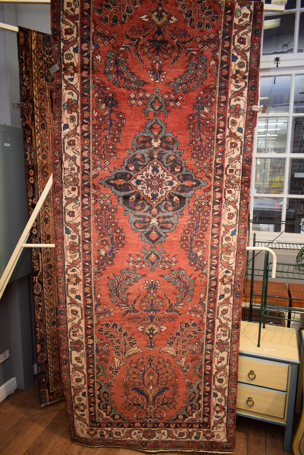 A SUPERB PERSIAN MEHRABAN HALL RUNNER, 100% WOOL PILE. STURDY & HARD-WEARING. FINELY HAND-KNOTTED VILLAGE WEAVE WITH DESIGN OF ELONGATED MEDALLION & CORNER MEDALLIONS IN A RED-TONED FIELD OF SYMMETRICAL FLORAL SPRAYS. FLORAL-PATTERNED BORDER. GALLERY INVENTORY. IN EXCELLENT CONDITION. CERTIFICATE OF AUTHENTICITY INCLUDED. SIZE: 318X106CM ORIGIN: PERSIA – RRP: $2,800 (LEONARD JOEL DELIVERY SIZE: LARGE)