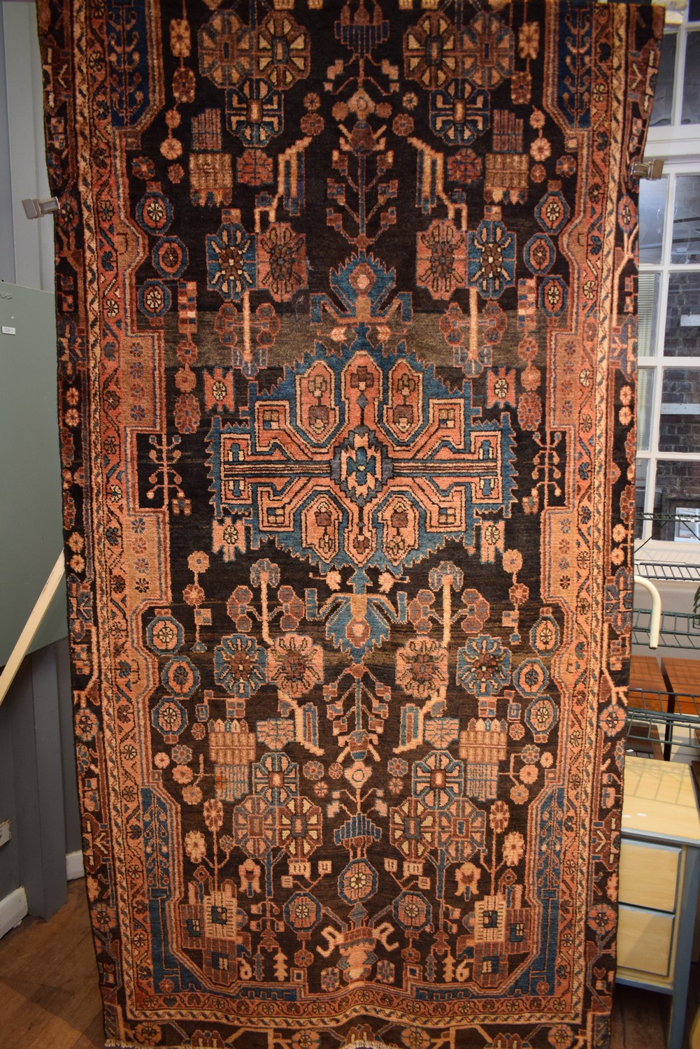 A PERSIAN NAHAVAND KELEGI RUG. 100% WOOL. NATURAL DYES. DENSE PILE. HAND-KNOTTED VILLAGE WEAVE WITH TRADITIONAL DESIGN OF STYLIZED MEDALLION SET WITHIN A FIELD OF DOUBLE URNS BEARING FLORAL FOLIAGE & VARYING BOLD FLORAL PATTERNS. GALLERY INVENTORY. IN EXCELLENT CONDITION. CERTIFICATE OF AUTHENTICITY INCLUDED. SIZE: 303X135CM RIGIN: PERSIA – RRP: $3,300 (LEONARD JOEL DELIVERY SIZE: LARGE)