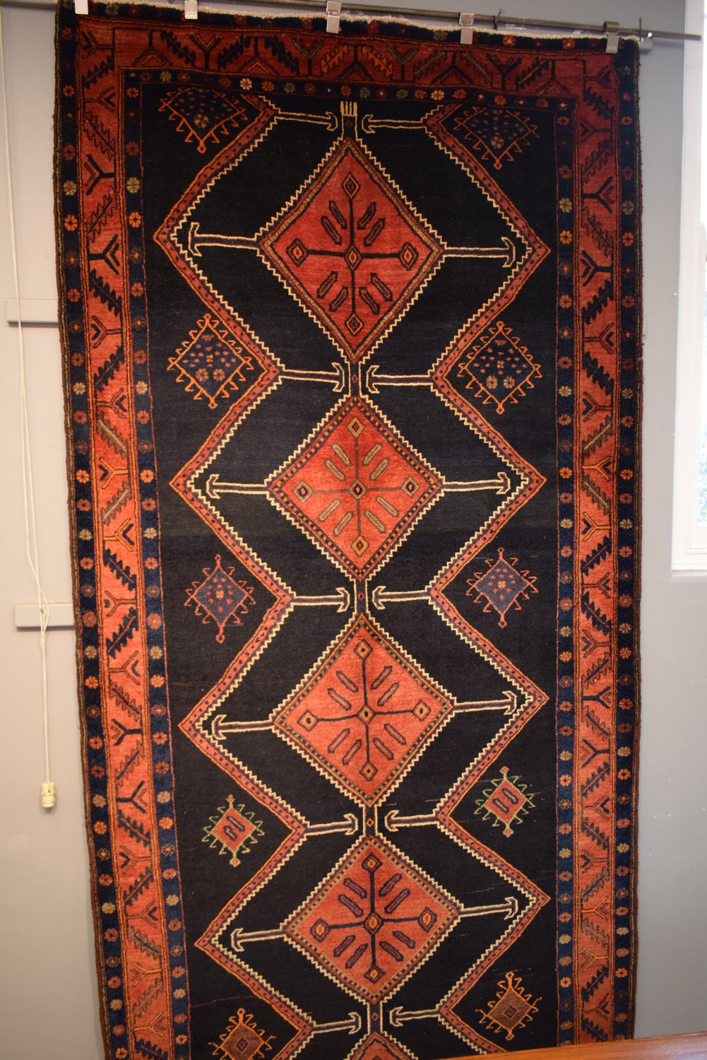 A SUPERB & RARE LARGE TRIBAL PERSIAN KOLYAIE RUG. 100% WOOL. SOLID & DENSE PILE. HAND-KNOTTED TRIBAL WEAVE & DESIGN OF REPEATING DIAMOND-SHAPED ANCHORED MEDALLIONS SET AGAINST TRIBAL MOTIFS. VIBRANT COLOURS. EX-GALLERY INVENTORY. IN MAGNIFICENT CONDITION. CERTIFICATE OF AUTHENTICITY INCLUDED. SIZE: 377X149CM ORIGIN: PERSIA – RRP: $4,900 (LEONARD JOEL DELIVERY SIZE: LARGE)