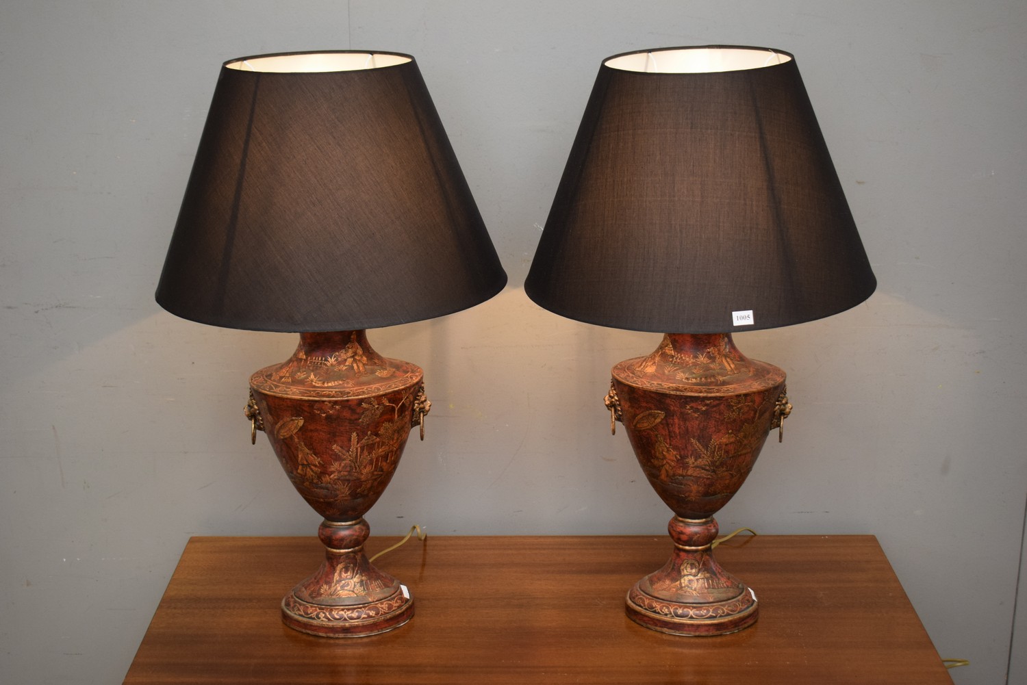 A PAIR OF CHINOISERIE STYLE TABLE LAMPS WITH HAND PAINTED DETAILING (84H CM) (LEONARD JOEL DELIVERY SIZE: MEDIUM)