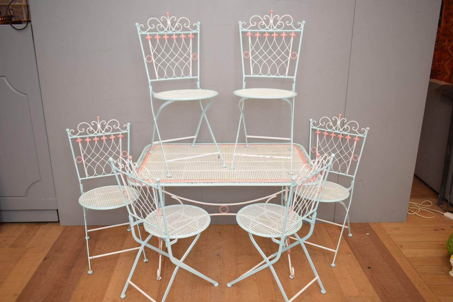 A SEVEN PIECE PAINTED METAL OUTDOOR SETTING (TABLE 72H x 120W x 80D CM) (LEONARD JOEL DELIVERY SIZE: LARGE)