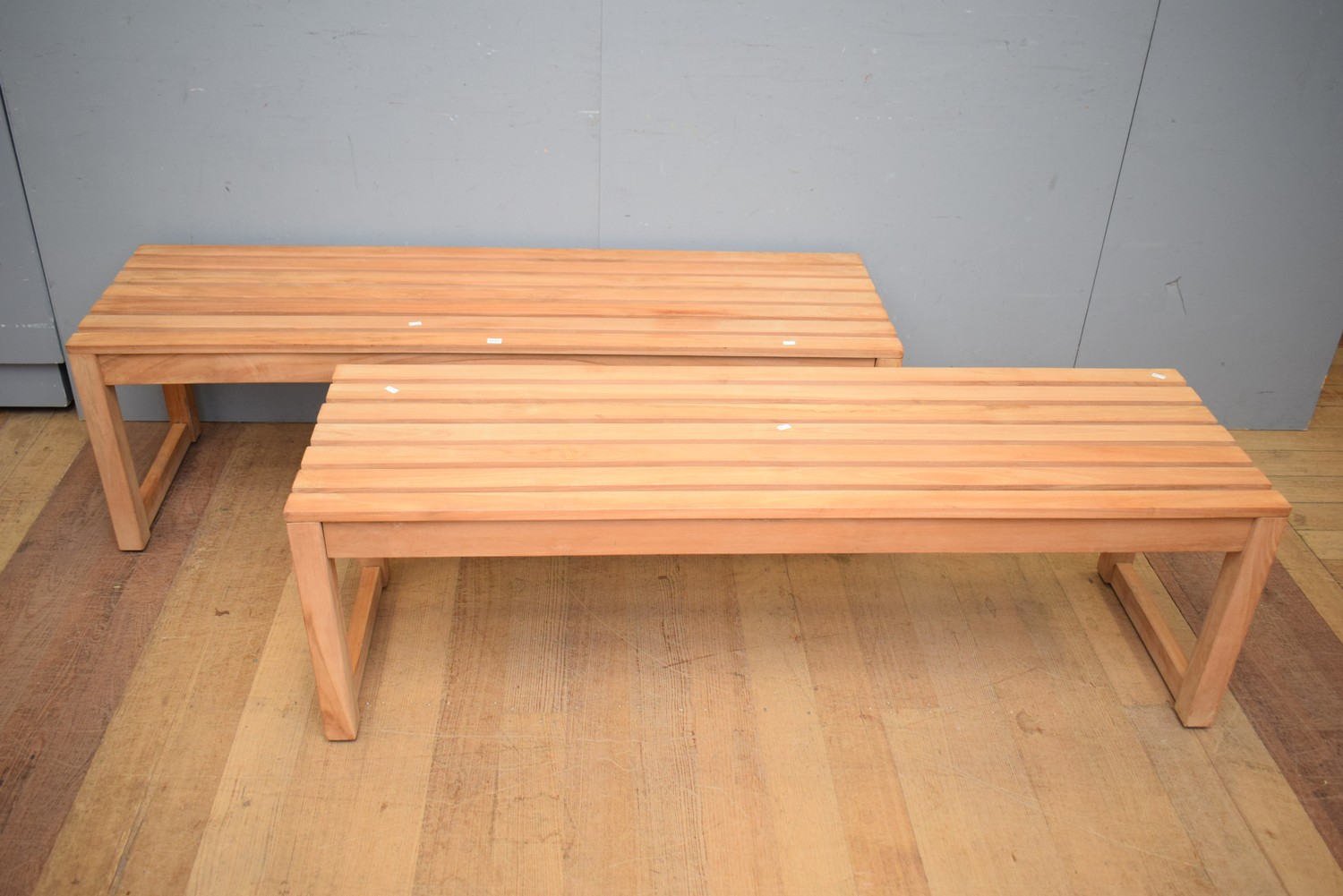 A PAIR OF TEAK OUTDOOR BENCHES (46H x 150W x 45D CM) (LEONARD JOEL DELIVERY SIZE: LARGE ITEM)