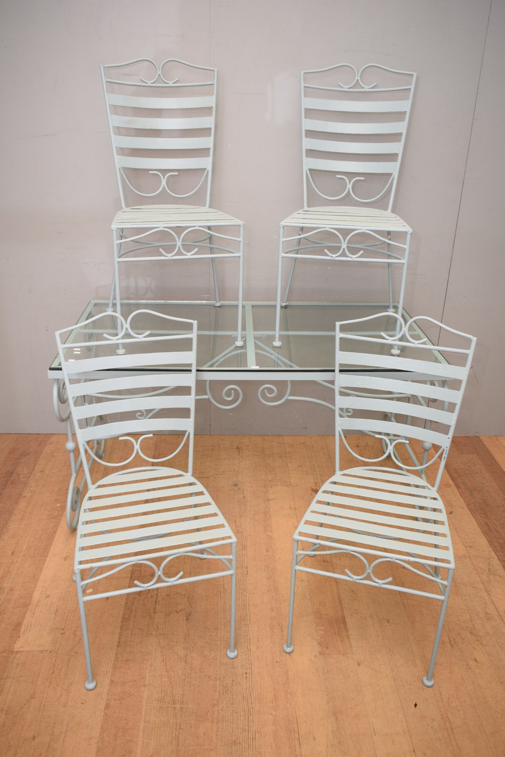 A FIVE PIECE WROUGHT IRON OUTDOOR SETTING (TABLE 74H x 139W x 75D CM) (PLEASE NOTE THIS HEAVY ITEM MUST BE REMOVED BY CARRIERS AT THE CUSTOMER'S EXPENSE. LEONARD JOEL STAFF CANNOT ASSIST CARRYING THIS ITEM) (X-LARGE ITEM)