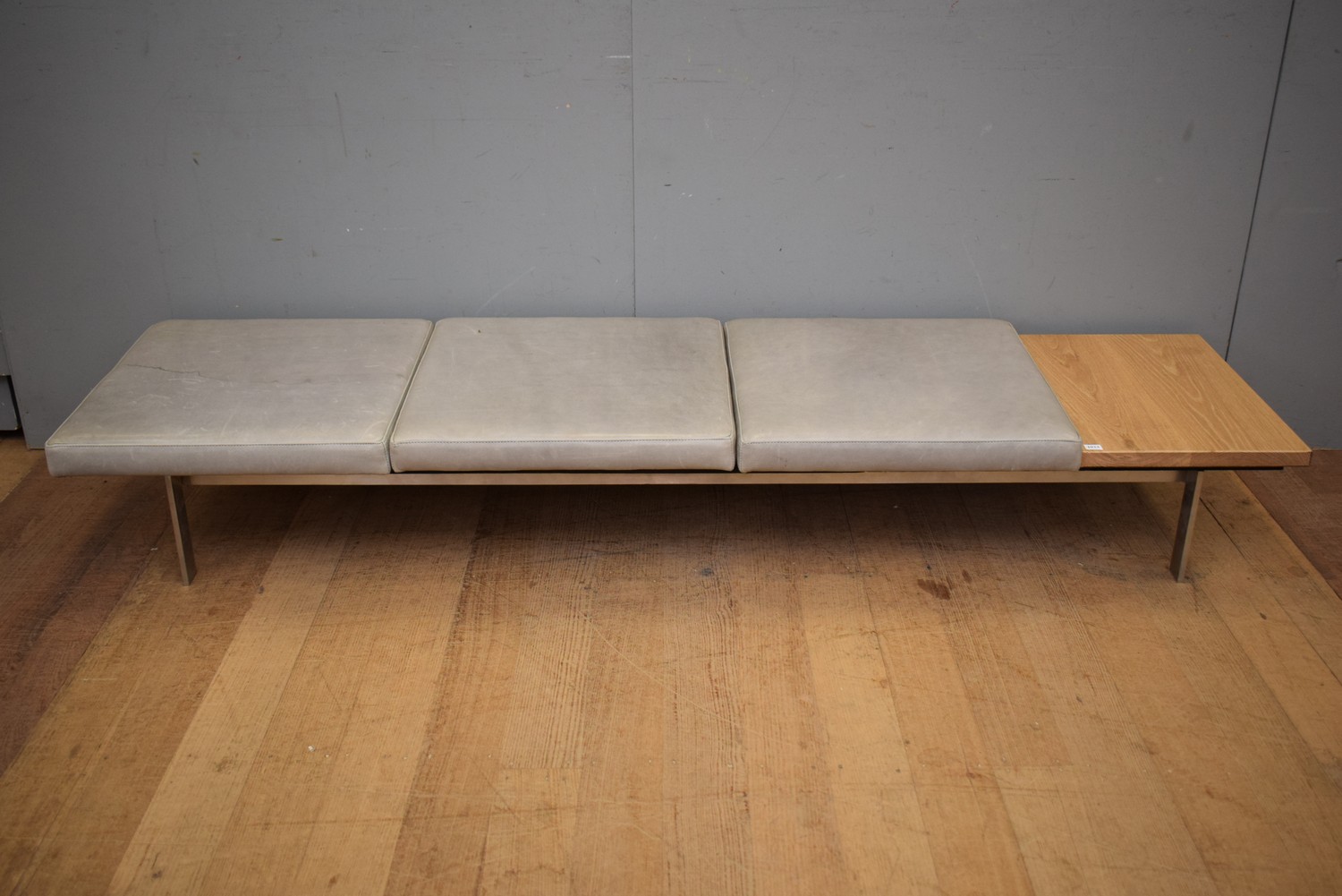 A VERONA LEATHER GALLERY BENCH WITH OAK SIDE TABLE AND STAINLESS STEEL LEGS (29H x 191W x 53D CM) (LEONARD JOEL DELIVERY SIZE: LARGE)