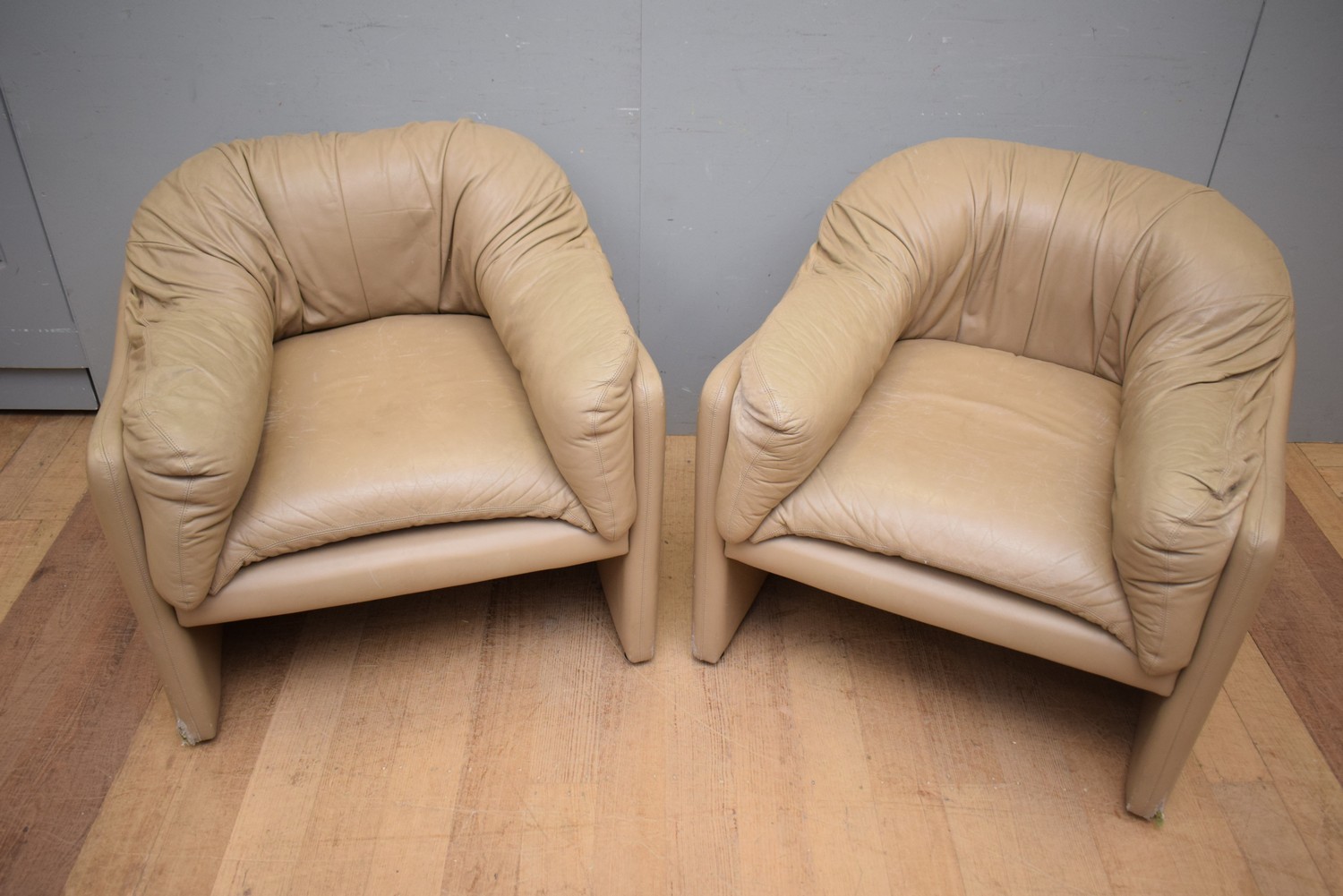 A PAIR OF LEATHER ARMCHAIRS (A/F - TEAR TO LEATHER) (75H X 80W X 80D CM) (LEONARD JOEL DELIVERY SIZE: LARGE)
