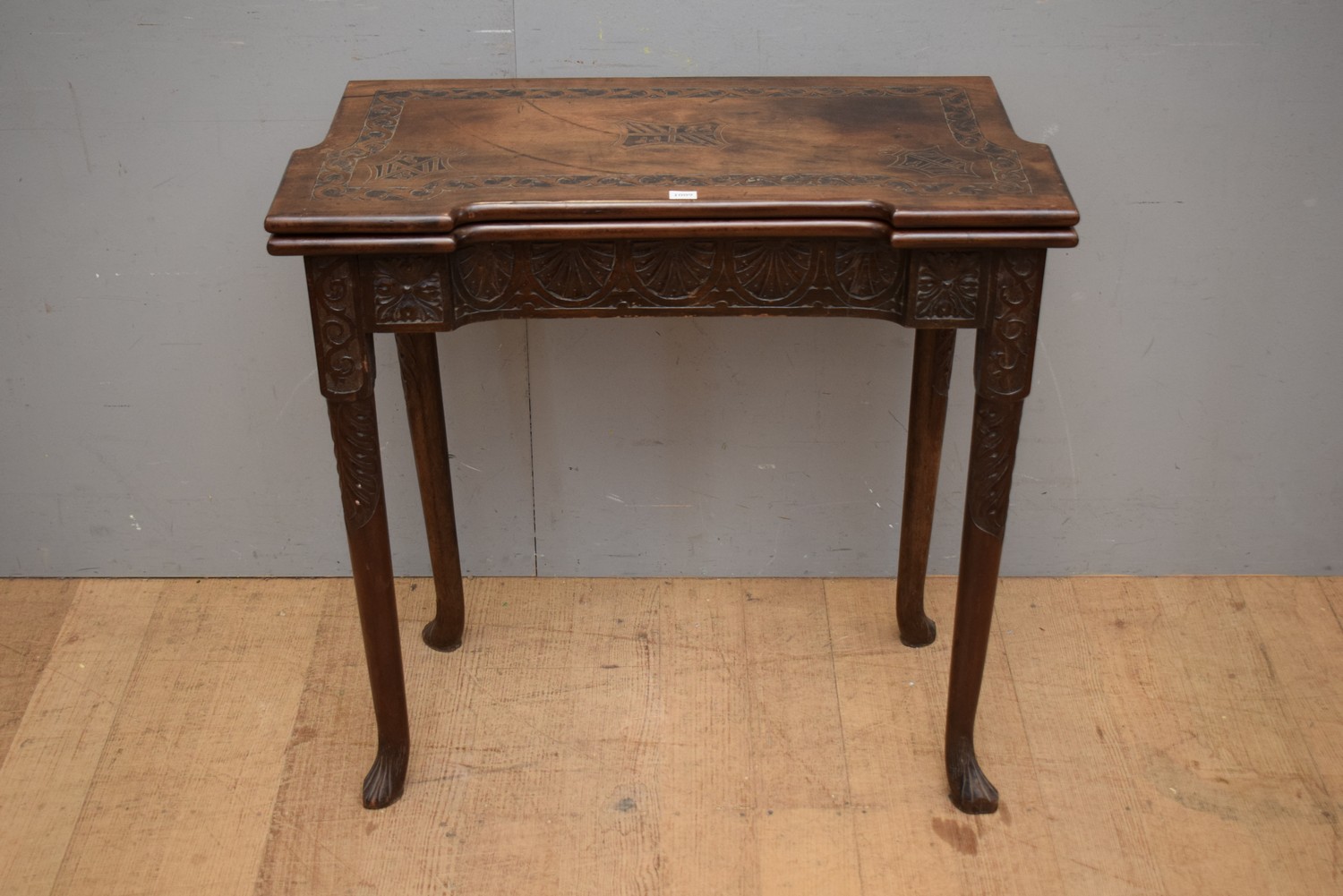 A GEORGE II MAHOGANY CARD TABLE, HEAVILY CARVED AND WITH INLAY DECORATION (A/F) (73H x (EXTENDED 75W x 75D CM) (LEONARD JOEL DELIVERY SIZE: MEDIUM)