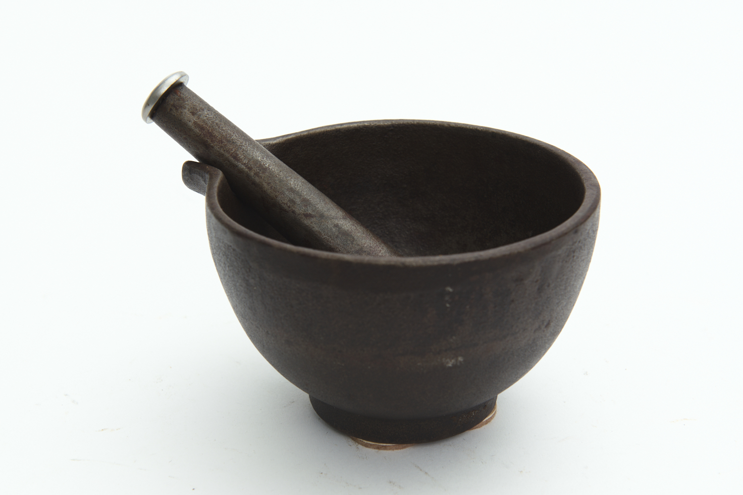 A CAST IRON AND STEEL HANDLED MORTAR AND PESTLE WITH IMPRESSED NUMBER, 15 CM DIAMETER, LEONARD JOEL DELIVERY SIZE: SMALL