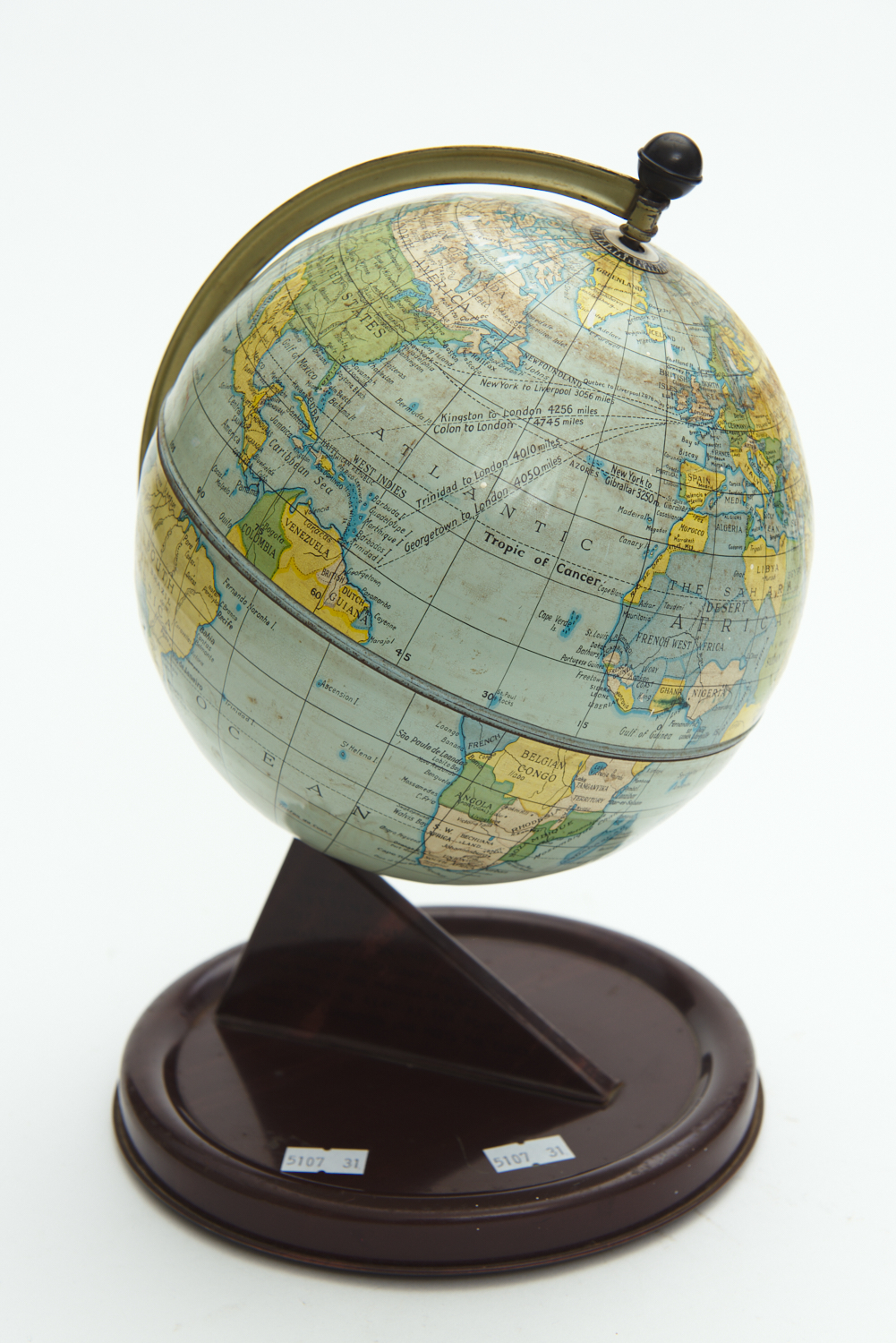 AN ENGLISH CHAD VALLEY TIN WORLD GLOBE, 26.5 CM HIGH, LEONARD JOEL DELIVERY SIZE: SMALL