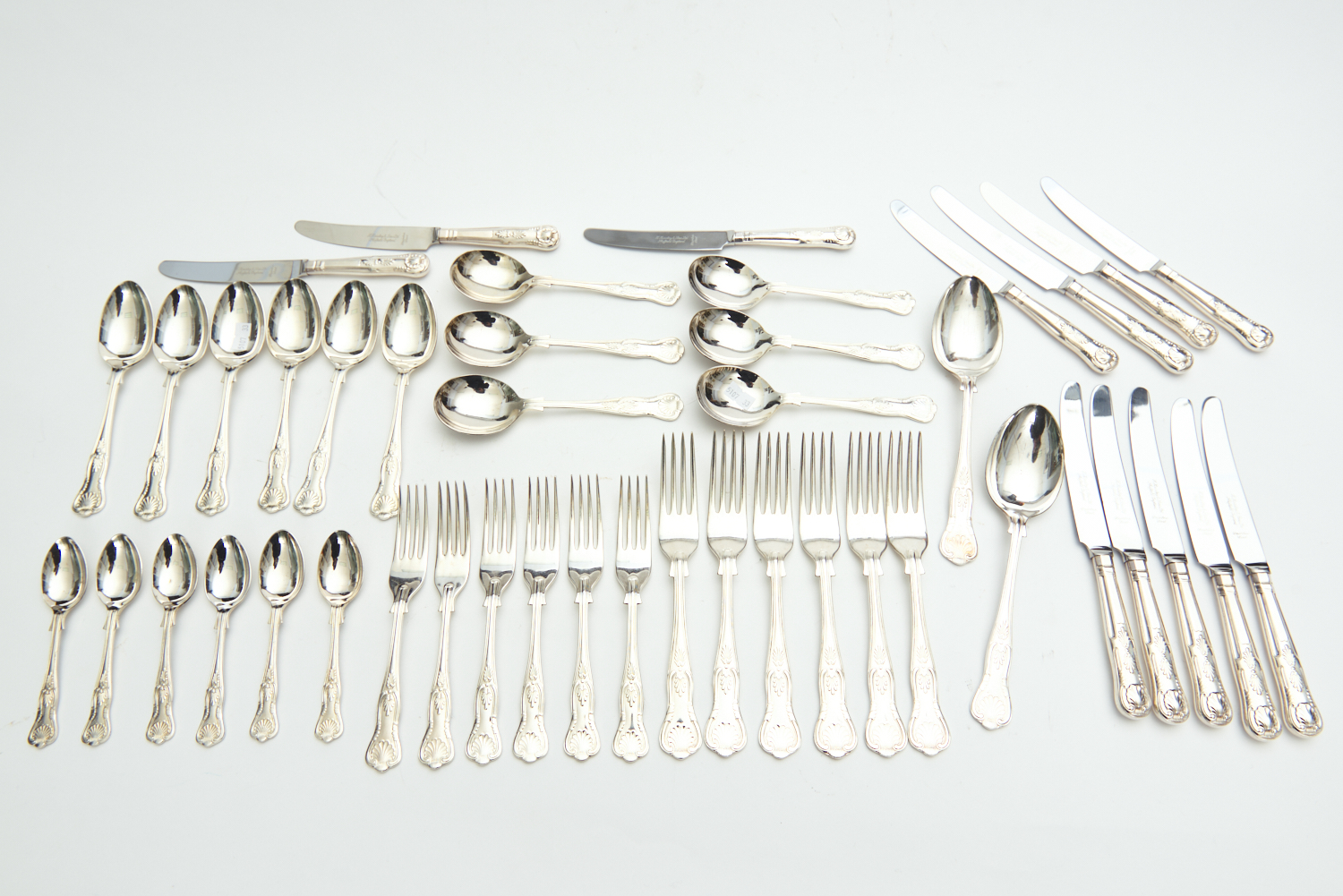 A 44 PIECE SETTING FOR SIX, ENGLISH H HOUSLEY & CO SILVER PLATE KING'S PATTERN CUTLERY SET, LEONARD JOEL DELIVERY SIZE: SMALL