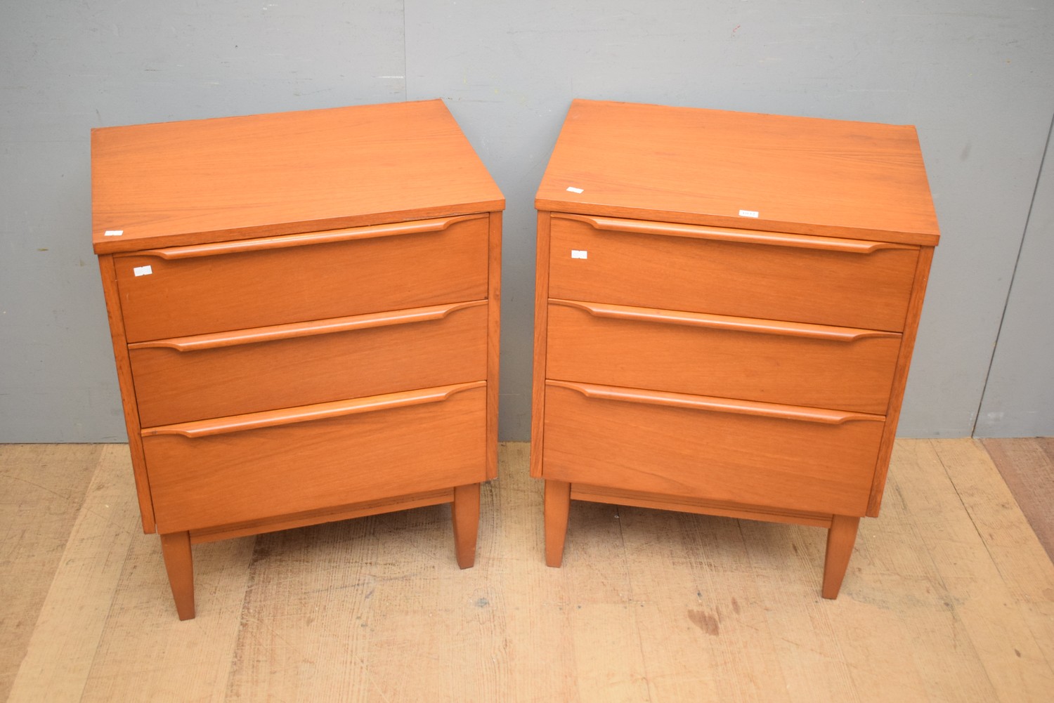 A PAIR OF 1960S AUSTRALIAN MADE TEAK THREE DRAWER BEDSIDE CABINETS ON SQUARED BULLET LEGS (A/F) (72H x 56W x 41D CM) (LEONARD JOEL DELIVERY SIZE: LARGE)