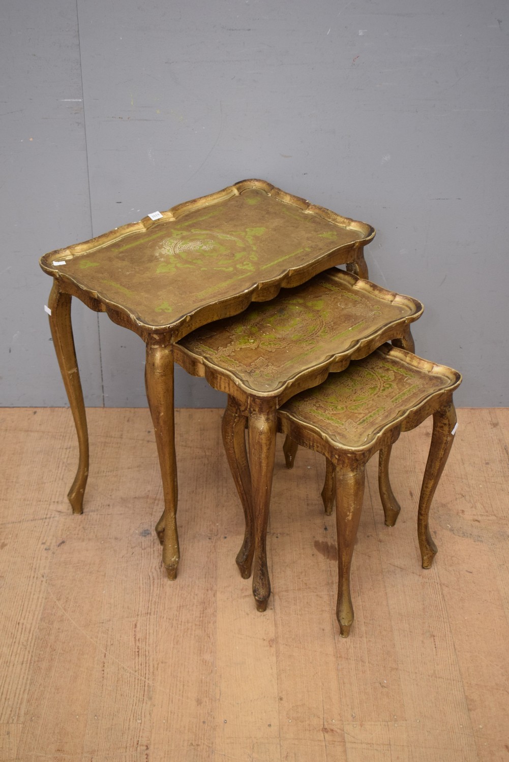 A NEST OF THREE 1900S ITALIAN FLORENTINE GILTWOOD TABLES WITH GREEN DETAILING (A/F - DAMAGE TO LEG) (LARGEST 58H x 56W x 35D CM) (LEONARD JOEL DELIVERY SIZE: MEDIUM)