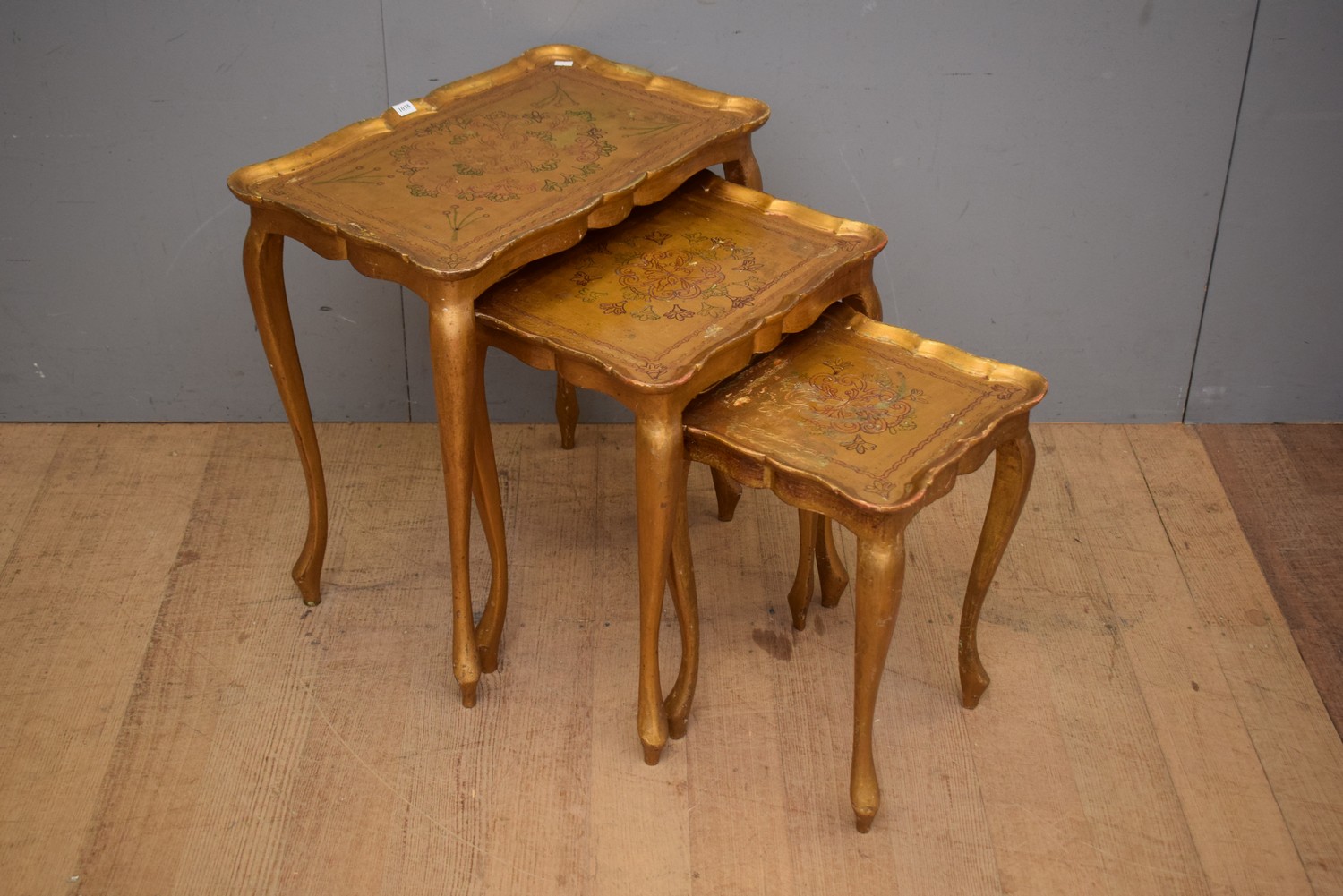 A NEST OF THREE 1900S ITALIAN FLORENTINE GILTWOOD TABLES (LARGEST 58H X 55W x 35D CM) (LEONARD JOEL DELIVERY SIZE: MEDIUM)
