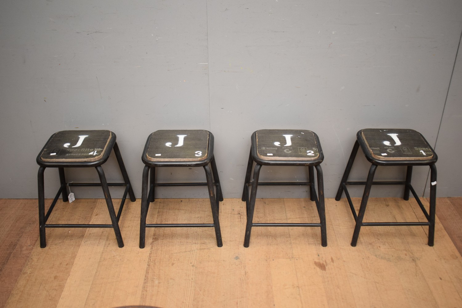 A SET OF FOUR BLACK INDUSTRIAL STOOLS 1-4 (44H x 39W x 39D CM) (LEONARD JOEL DELIVERY SIZE: MEDIUM)
