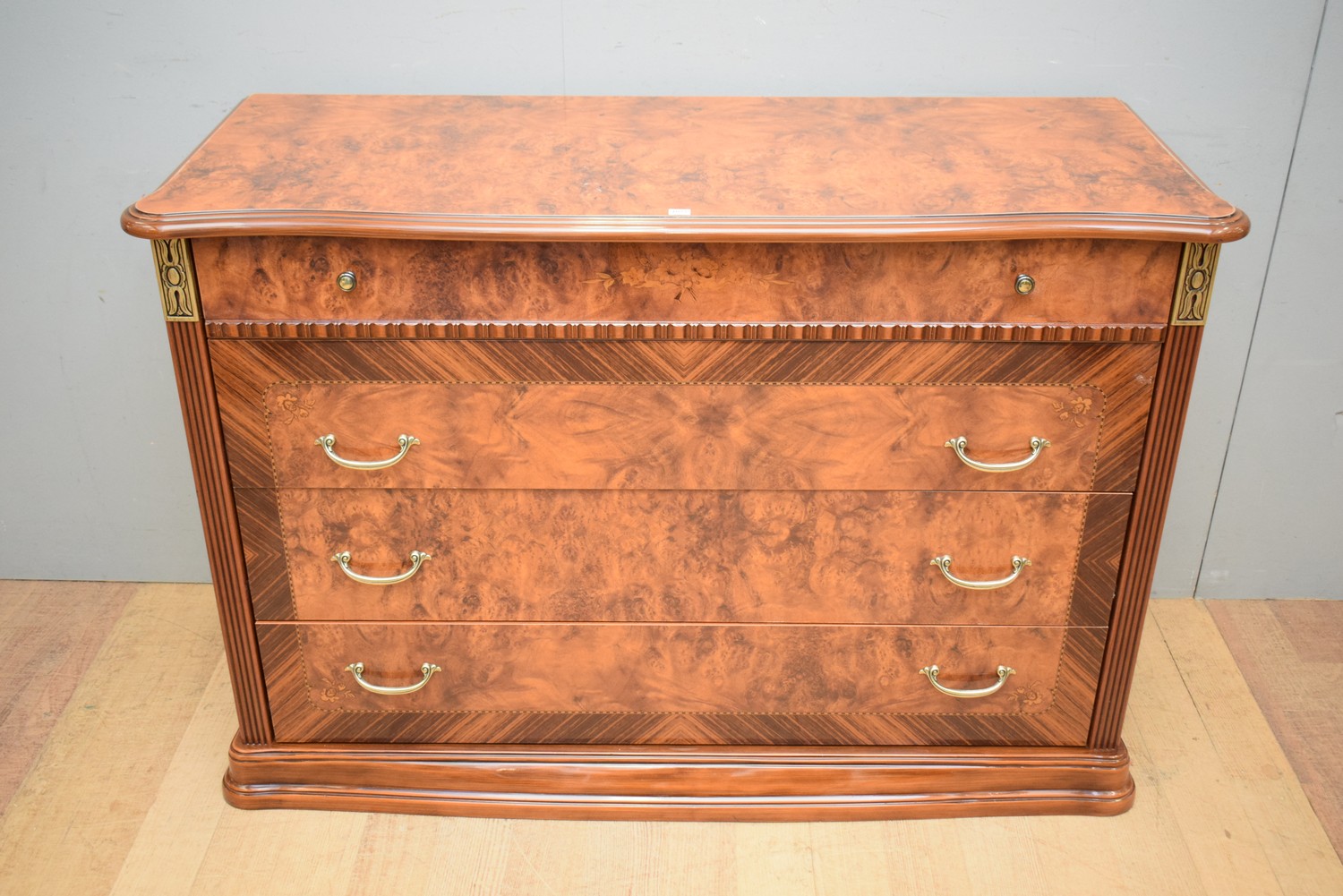 AN ITALIAN BURR WALNUT FOUR DRAWER COMMODE (A/F - TO TOP) (92H x 133W x 52D CM) (PLEASE NOTE THIS HEAVY ITEM MUST BE REMOVED BY CARRIERS AT THE CUSTOMER'S EXPENSE. LEONARD JOEL STAFF CANNOT ASSIST CARRYING THIS ITEM) (X-LARGE ITEM)