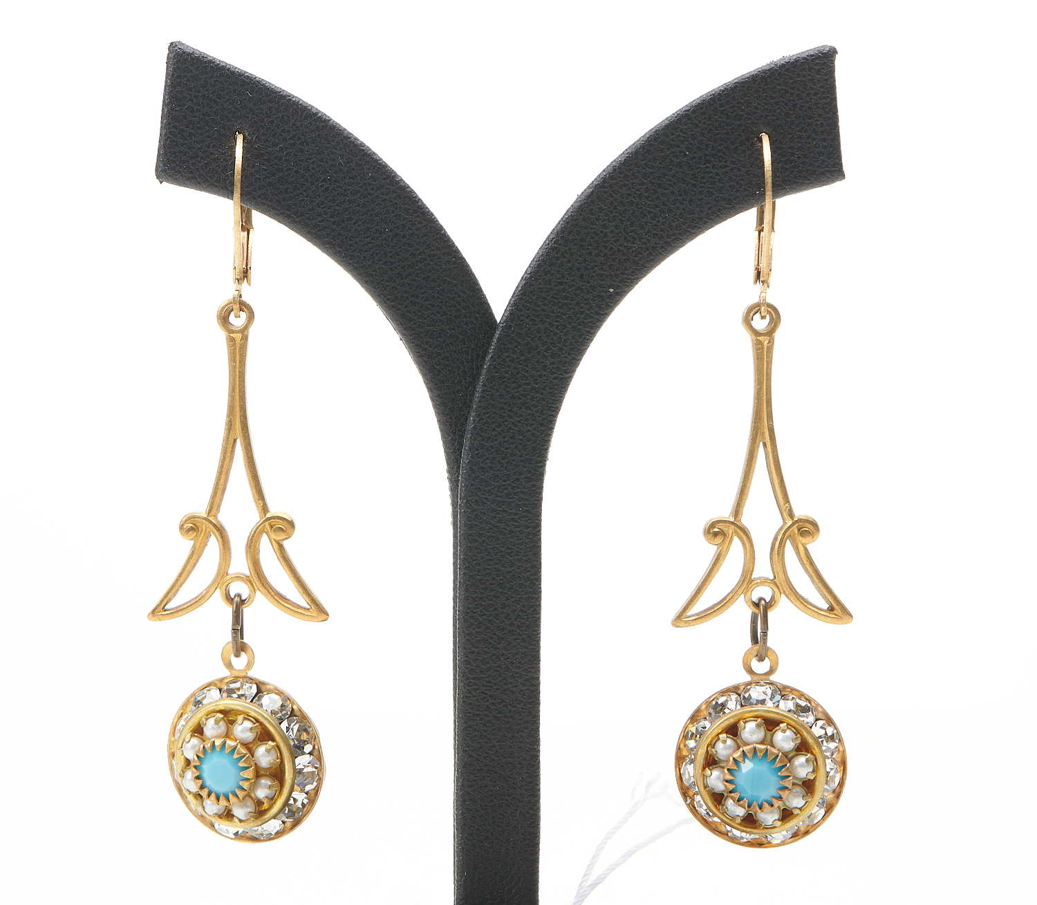 A PAIR OF ART DECO STYLE PASTE SET DROP EARRINGS IN GILT, TO CONTINENTAL FITTINGS, LENGTH 60MM
