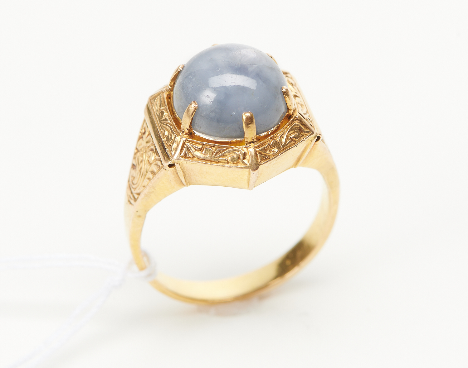 A STAR SAPPHIRE RING WITH FINE ENGRAVINGS, ACID TESTED IN 18CT GOLD, SIZE R, 7.7GMS