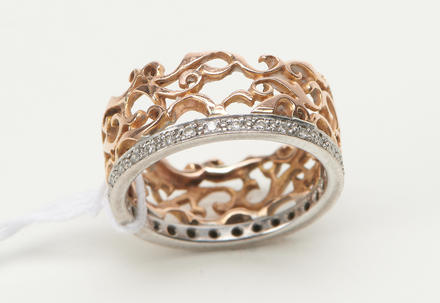 A DIAMOND SET RING FEATURING AN OPENWORK SCROLL DECORATION, IN TWO TONE 18CT GOLD, SIZE R, 7.7GMS
