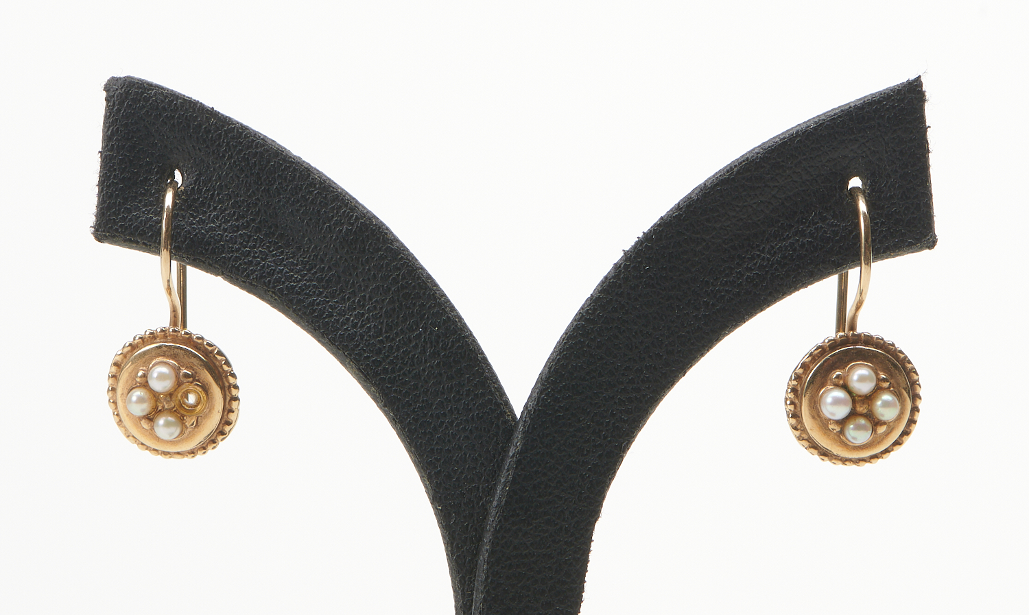 A PAIR OF SEED PEARL EARRINGS IN 9CT GOLD, LENGTH 20MM, 2.1GMS (ONE SEED PEARL DEFICIENT)